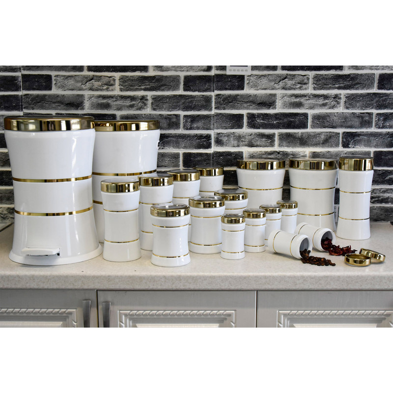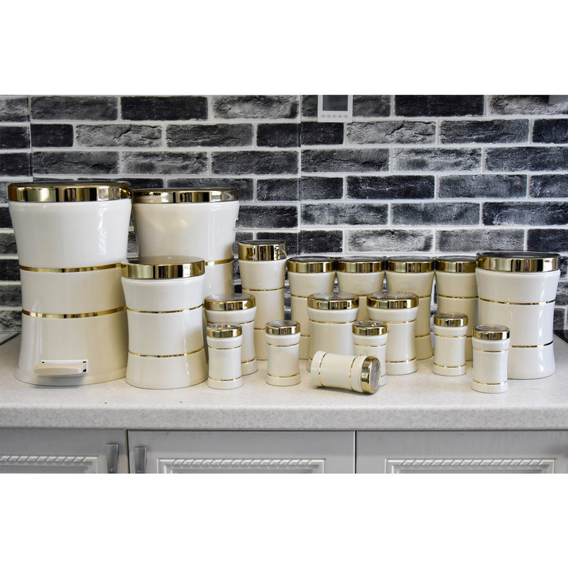 سرویس آشپزخانه 18 پارچه از جنس فلز ضد زنگ شامل قوطی های بسیار با کیفیتی است که در اندازه های مختلف تولید شده اند. میتوانید از این قوطی ها برای نگهداری حبوبات، برنج، قند و شکر، ادویه جات و … استفاده کنید. همچنین این سرویس دارای یک سطل زباله بزرگ می باشد که از یک بدنه فلزی و یک سطل داخلی قابل جدا شدن از جنس پلاستیک تشکیل شده تا شستشو ی آن آسان باشد. سطل داخلی دارای یک دسته استیل است و به راحتی بیرون می آید. برای باز کردن درب این سطل یک پدال در نظر گرفته شده و درب آن به صورت آرام بسته می شود. این سرویس شامل: سطل زباله ، سطل برنج ، 2عدد سطل بزرگ قند و شکر ، 4 عدد بانکه 1.5کیلویی حبوبات ، 3عدد بانکه 1کیلویی پاسماوری ، 6عدد بانکه کوچک جا ادویه و 1عدد بانکه استوانه ای برای نگهداری ماکارونی می باشد.