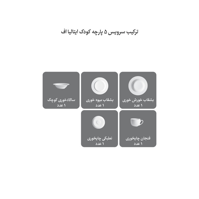 | اقلام سرویس | بشقاب خورشخوری , پیشدستی , فنجان , نعلبکی , پیاله |