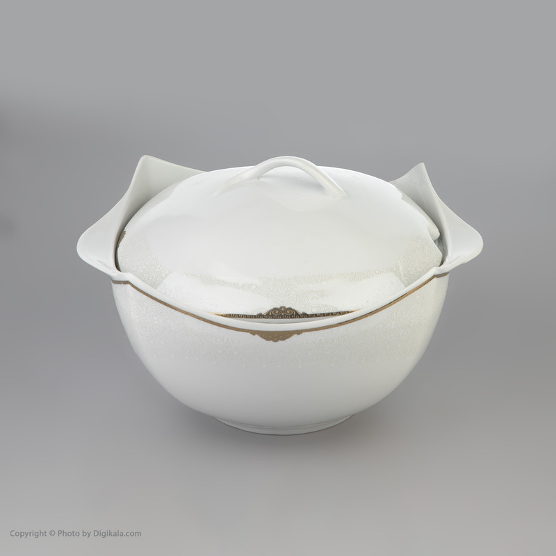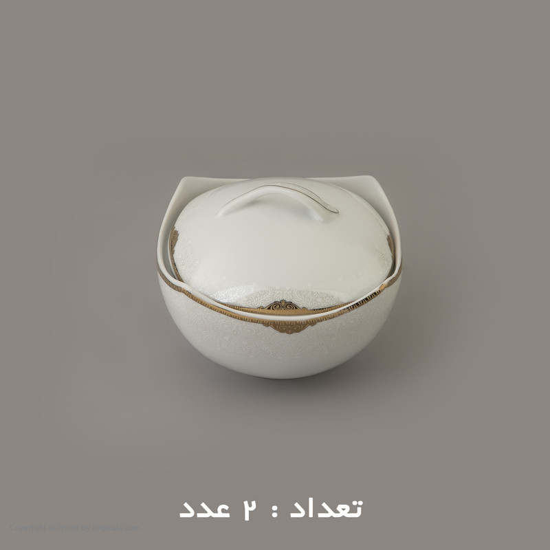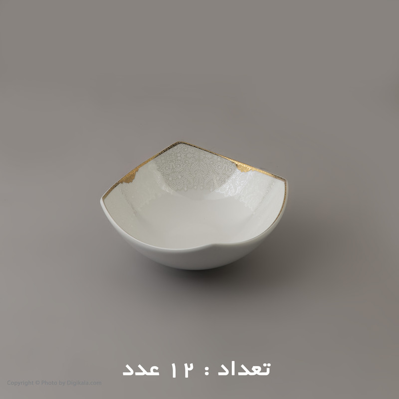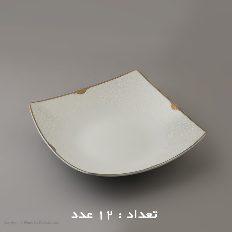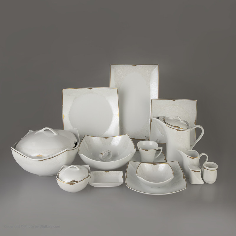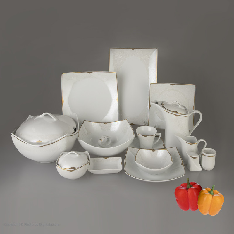 | سایر توضیحات | - دارای 2 عدد دیس به ابعاد 35×2×22 سانتیمتر و وزن 920 گرم - دارای 12 عدد پیش دستی به ابعاد 20×2×20 سانتیمتر و وزن 460 گرم - دارای 1 عدد کاسه سالاد خوری به ابعاد 22×10×22 سانتیمتر و وزن 755 گرم - دارای 12 عدد بشقاب خورشت خوری به ابعاد 20×6×20 سانتیمتر و وزن 505 گرم - دارای 12 عدد بشقاب غذاخوری به ابعاد 25×5×25 سانتیمتر و وزن 785 گرم - دارای 1 عدد قوری به ابعاد 21×20×21 سانتیمتر و وزن 900 گرم - دارای 1 عدد سوپ خوری به ابعاد 20×15×20 سانتیمتر و وزن 2000 گرم - دارای 2 عدد قندان به ابعاد 11×6×11 سانتیمتر و وزن 320 گرم - دارای 12 عدد پیاله به ابعاد 13×7×13 سانتیمتر و وزن 200 گرم - دارای 6 عدد فنجان به ابعاد 11×7×7 سانتیمتر و وزن 215 گرم - دارای 6 عدد نعلبکی به ابعاد 15×2×15 سانتیمتر و وزن 195 گرم - دارای 4 عدد کره خوری به ابعاد 12×3×8 سانتیمتر و وزن 120 گرم - دارای یک عدد جای خلال به ابعاد 5×7×5 سانتیمتر و وزن 65 گرم - دارای 12 عدد حلقه دستمال به ابعاد 6×3×5 سانتیمتر و وزن 60 گرم - دارای 4 عدد سس خوری به ابعاد 13×7×11 سانتیمتر و وزن 200 گرم - دارای 6 عدد نمک پاش به ابعاد 5×3×6 سانتیمتر و وزن 80 گرم |