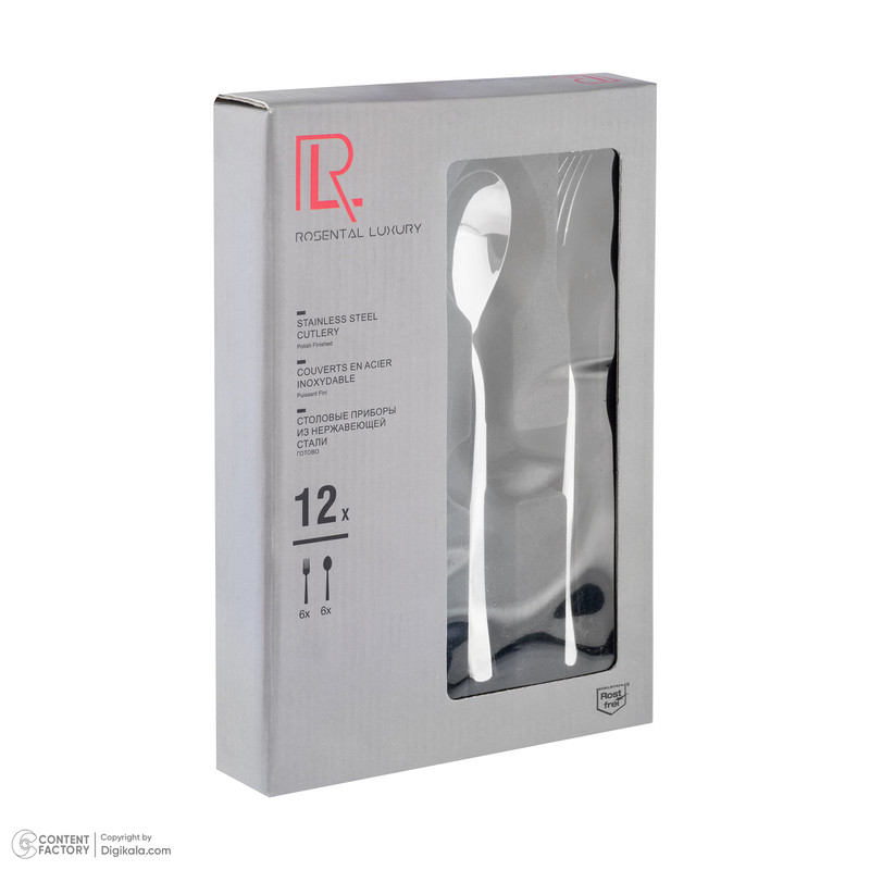 قاشق و چنگال 12 پارچه مدل دونا مناسب برای 6 نفر است . این محصول از استیل ضد زنگ براق با تکنولوژی شرکت زولینگن آلمان تهیه شده است، که در بسته بندی مقوایی عرضه میشود. طراحی ساده و زیبای دونا باعث شده یکی از پرطرفدارترین محصولات رزنتال باشد.