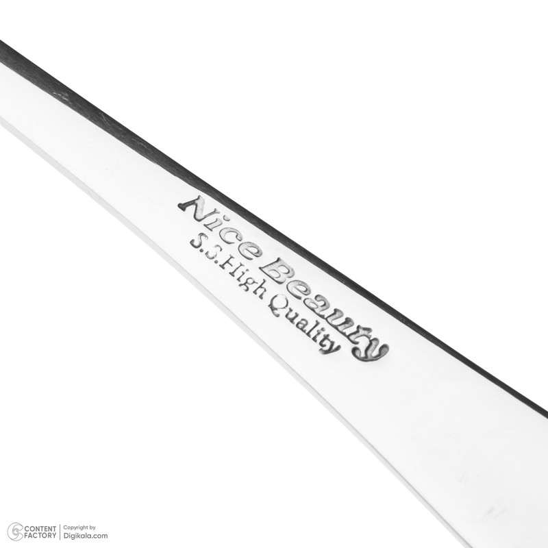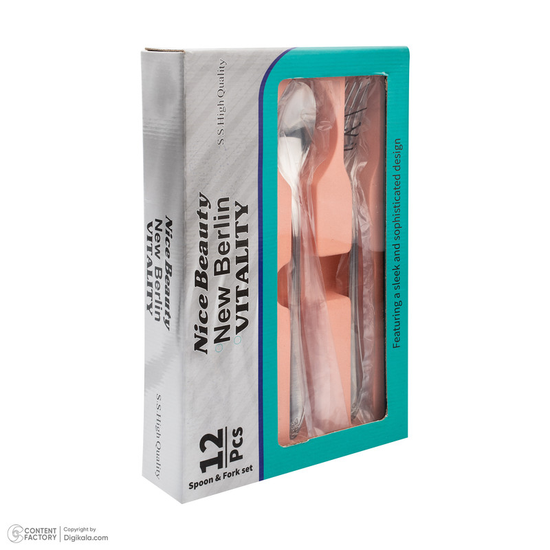 قاشق و چنگال 12 پارچه " نایس بیوتی " مناسب برای 6 نفر است . این محصول از استیل ضد زنگ براق با تکنولوژی شرکت زولینگن آلمان تهیه شده است، که در بسته بندی مقوایی عرضه میشود. طراحی ساده و زیبای آن باعث شده یکی از پرطرفدارترین محصولات نایس بیوتی باشد.ضمن اینکه مدل 381 ساخته شده از ورق استیل18/10ضدزنگ با ضخامت3/5میلیمتر قابلیت شستشو در ماشین ظرفشویی را دارد.