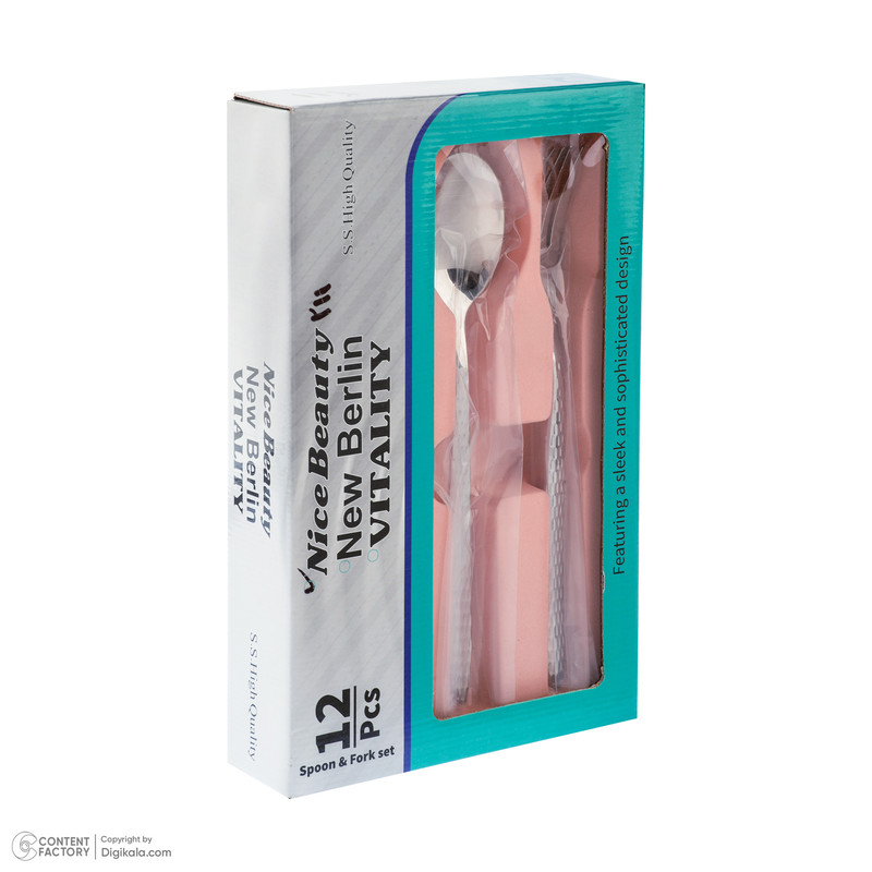 قاشق و چنگال 12 پارچه " نایس بیوتی " مناسب برای 6 نفر است . این محصول از استیل براق با تکنولوژی شرکت زولینگن آلمان تهیه شده است، که در بسته بندی مقوایی عرضه میشود. طراحی ساده و زیبای آن باعث شده یکی از پرطرفدارترین محصولات شرکت صنایع استیل آرمان کاوه باشد.ضمن اینکه این محصول ساخته شده از ورق استیل18/10ضدزنگ با ضخامت3/5میلیمتر قابلیت شستشو در ماشین ظرفشویی را دارد.