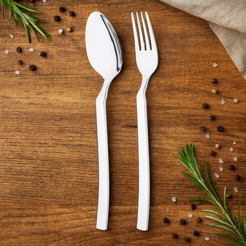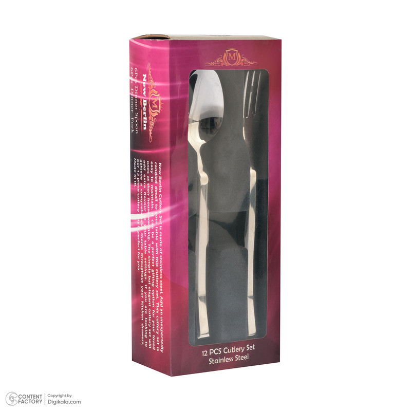 سرویس قاشق و چنگال 12 پارچه مدل میلان براق شامل 6 عدد قاشق غذاخوری و 6 عدد چنگال غذاخوری است.طراحی ساده و زیبای مدل میلان باعث شده یکی از پرطرفدارترین مدل های قاشق وچنگال باشد.محصول فوق ساخته شده از استیل ضد زنگ و بدون تغییر رنگ با کفه آسیایی است.