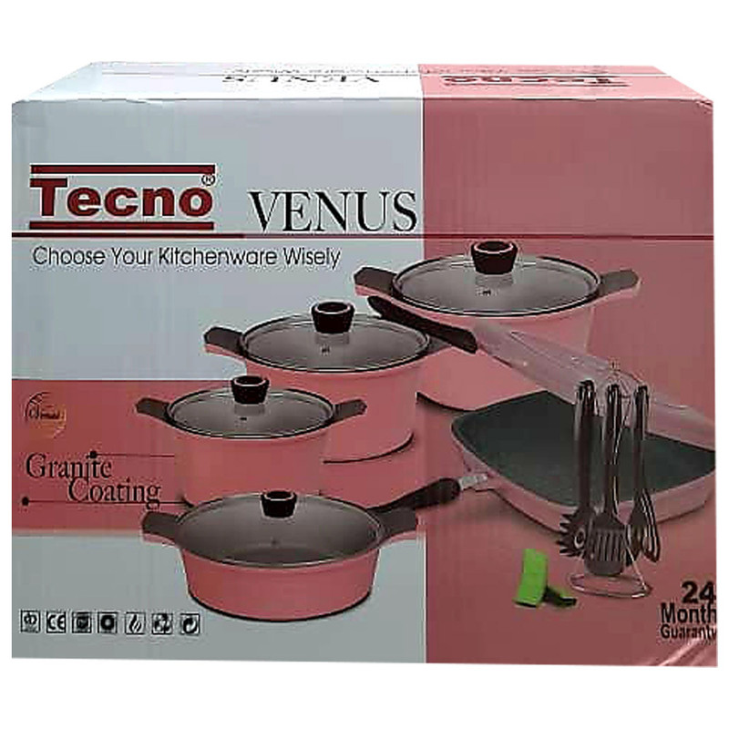 سرویس پخت و پز 19 پارچه تکنو مدل ونوس شامل چهار عدد قابلمه سایز 20 ، 24 ، 28 و 32 سانتیمتر و یک عدد تابه سایز 28 و یک تابه رژیمی سایز 33 به همراه ست کفگیر ملاقه و یک جفت دستگیره سیلیکونی است. بدنهی این سرویس از آلومینیوم الیاژی انتخاب شده و روکش داخلی آن گرانیت است.از مزایای این قابلمه علاوه بر کیفیت عالی گرانیت آن می توان به قابلیت استفاده در فر اشاره کرد که به دلیل داشتن دسته های مقاوم در برابر حرارت از جنس بدنه قابلمه است.سرویس قابلمه ونوس علاوه بر داشتن کیفیت بالا ، دارای ظاهری شکیل و زیبا می باشد.