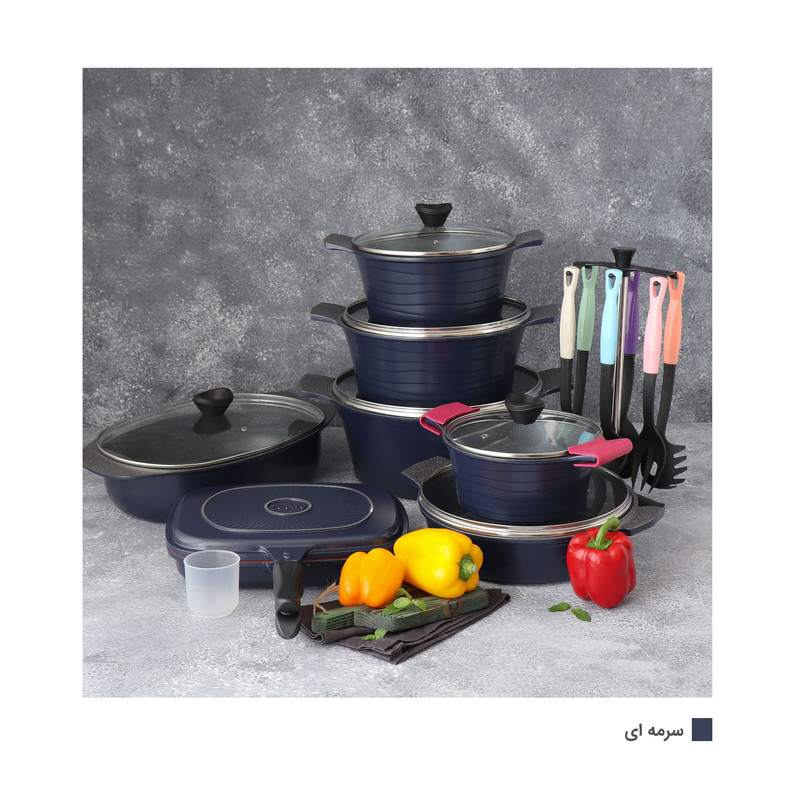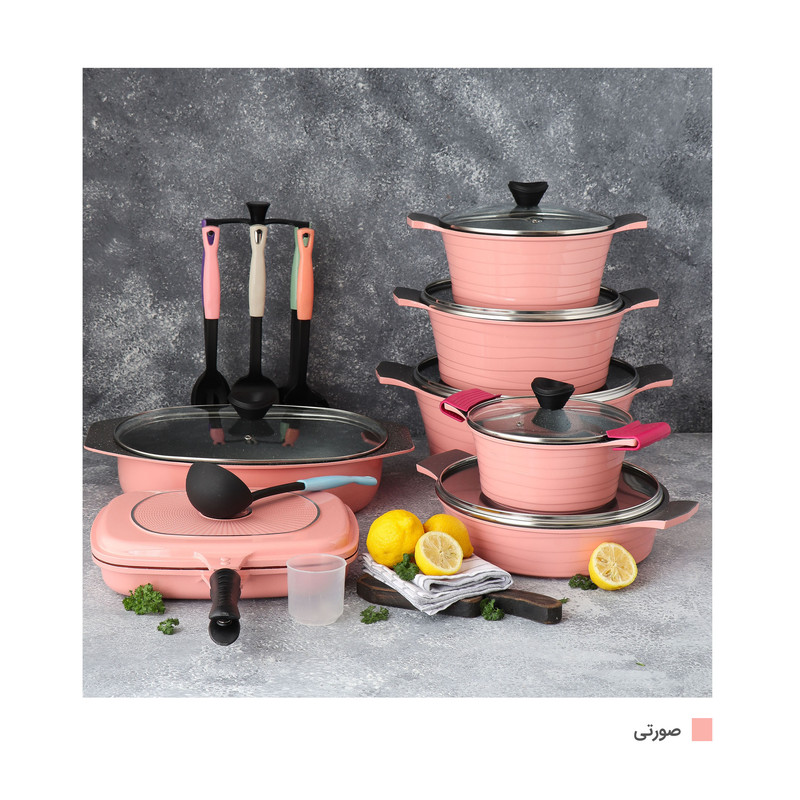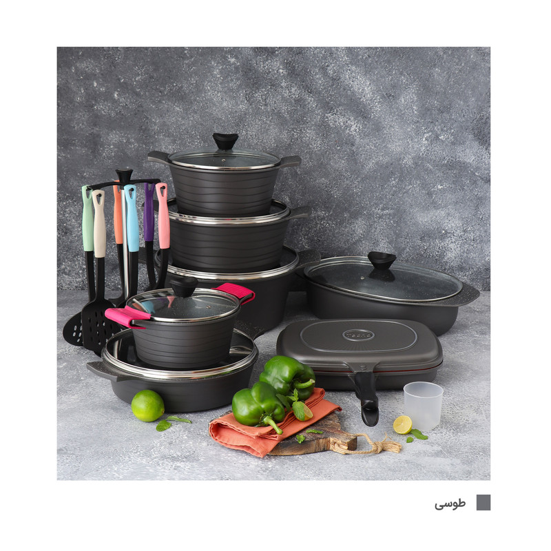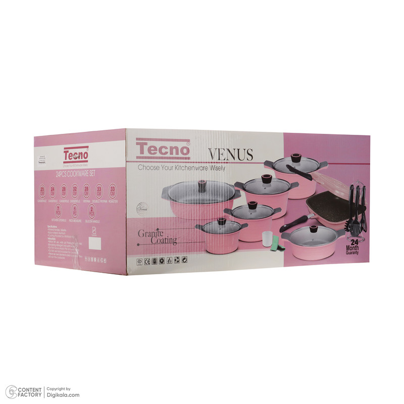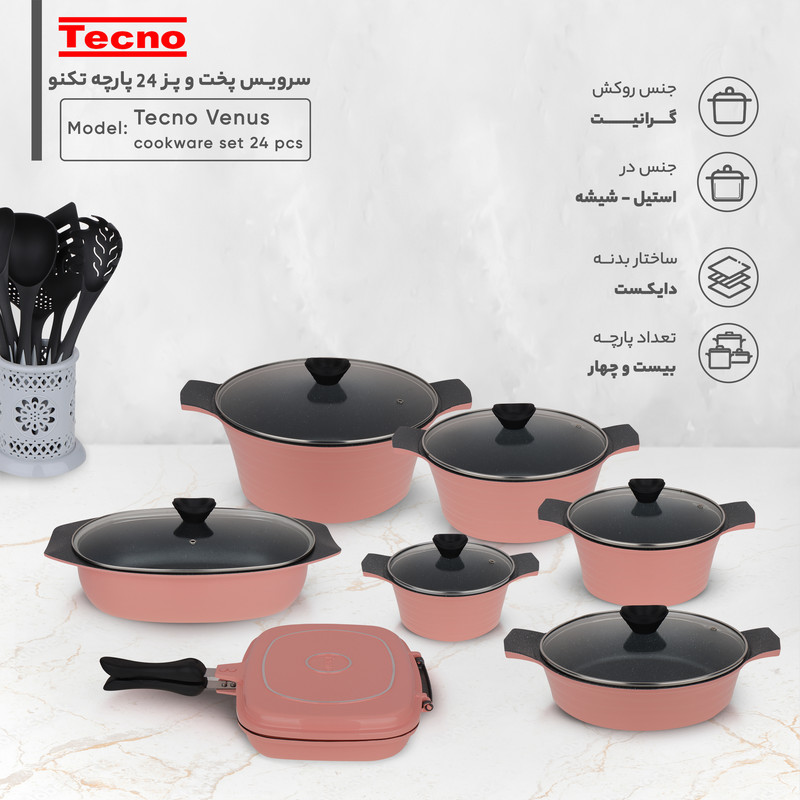 سرویس پخت و پز 24 پارچه تکنو مدل ونوس شامل قابلمههای مختلف در اندازه و تابههای متنوع است. این سرویس از جنس دایکاست آلومینیوم (چدن ) و با پوشش گرانیت نچسب تولیدشده و دارای 4 قابلمه در سایز های 20 و 24 و 28 و 32 و یک تابه در سایز 28 و یک تابه رژیمی دو طرفه و همچنین یک رستر سایز 36 ( جهت پخت و طبخ مرغ و ماهی ) به همراه یک ست کفگیر ملاقه و دستگیره سیلیکونی و پیمانه می باشد. جنس بدنه قابلمهها و تابهها چون دراین روش در حالت فشارقالب گیری می شود ساختارمقاومی دارد و باعث میشود گرما به سرعت و بهطور یکنواخت منتقل شود و غذاها بهروش بهتری طبخ شوند. سرویس پخت و پز 24 پارچه تکنو مدل ونوس ، با ویژگی های بیان شده، یک انتخاب عالی برای داشتن یک تجربه آشپزی مطمئن و راحت است. این سرویس دارای جنس کفه دو جداره و در پیرکس با نوار استیل است که باعث تحمل دمای بالا و حفظ حرارت بهتر غذا میشود. همچنین، دارای سیستم با سوپاپ تخلیه بخار است که در فشار بخار غذا، احتیاج به هیچ گونه دخالت اضافی برای تخلیه بخار ندارد. روکش گرانیت قابلیت نچسب بودن روی کفه را دارد و باعث جلوگیری از چسبیدن مواد غذایی به کف ظرف خواهد شد. قپه این سرویس از جنس باکالیت ساخته شده است که باعث ایمنی در دستان شما میشود. این سرویس قابل استفاده در اجاق گاز بوده و همچنین قابل شستوشو با دست را داراست.