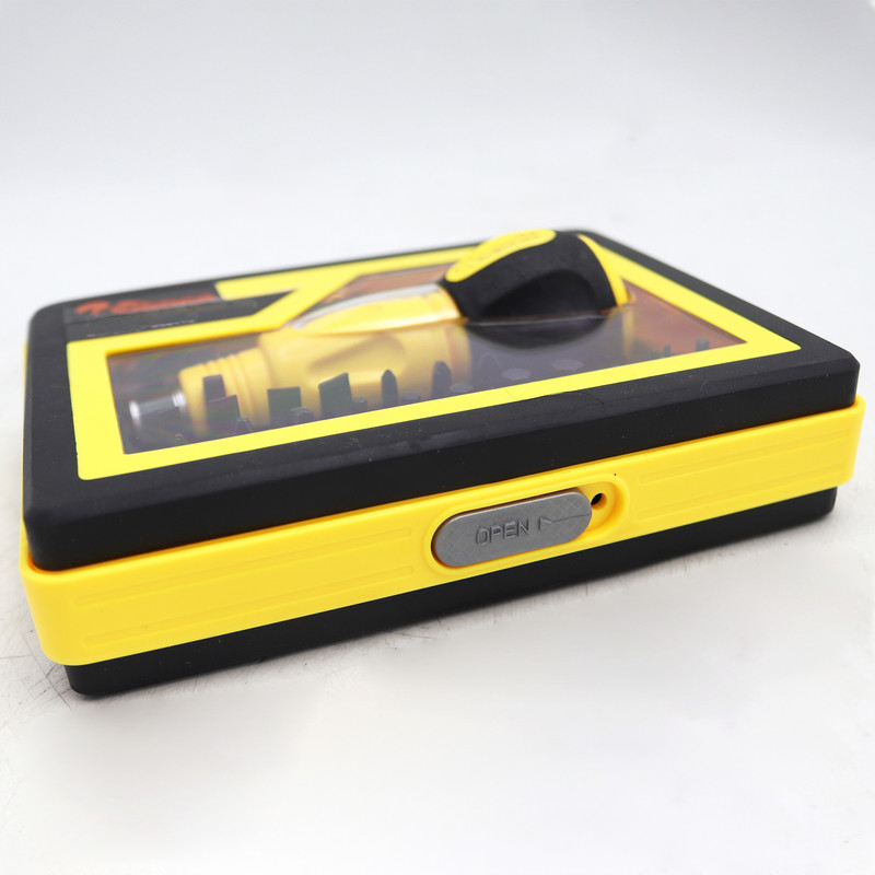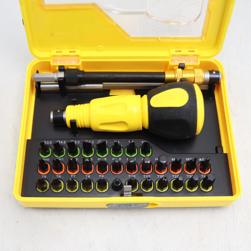 | توضیحات تعداد | - پنج عدد سری دوسو با سایز: 3،4،5،6،7 - سه عدد سری سه گوش با سایز: Y1، Y2 ، Y3 - چهار عدد سری چهارسو با سایز: PH0، PH1، PH2، PH3 - پنج عدد سری آلنی با سایز: H2.5، H3، H4، H5، H6 - یک عدد سری سه گوش با سایز: 2.3 - دو عدد سری شکافدار با سایز: M6، M8 - یازده عدد سری ستارهدار با سایز: T5، T6، T7، T8، T9، T10، T15، T20، T25، T30، T40 - دارای یک دسته پیچگوشتی جغجغهای - دارای یک کمکی انعطاف پذیر به طول 13.5 سانتیمتر - دارای یک کمکی به طول 13 سانتیمتر - دارای یک رابط متصل پیچگوشتی |