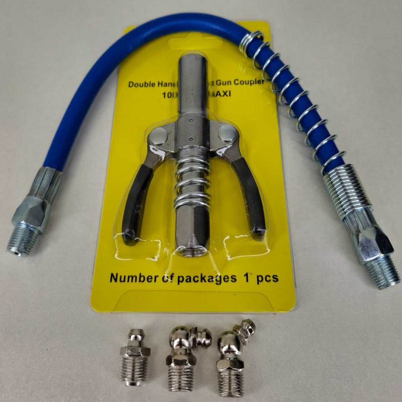 سری گریس زن کلیپسی مدل دو پره همراه با شلنگ فشار قوی و فنری 30 سانتی + یک عدد گریس خور مستقیم + یک عدد گریس خور 45 درجه + گریس خور 90 درجه شامل میشود .