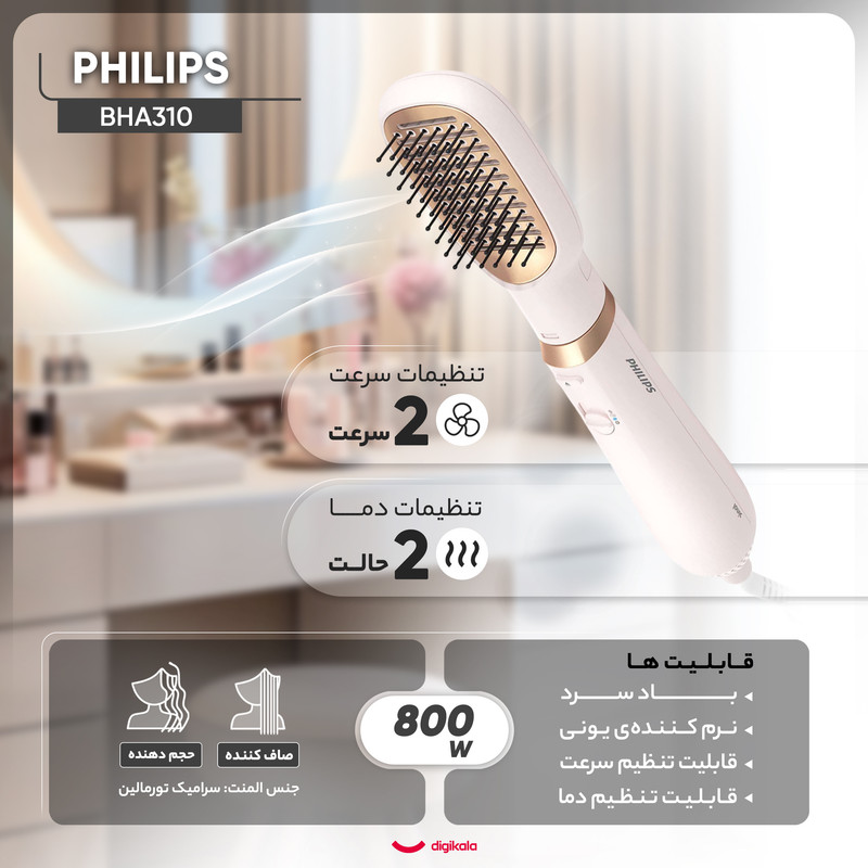 | سایر مشخصات | سشوار برسدار تخت برای صافی و خشک کردن - 800 وات - صفحات سرامیک با روکش ارگان برای حداقل اسیب ب مو - ایونیک برای فریز کردن و ضد وزی و اسیب کمتر ب مو - تنظیم حرارت 3 حالته - برس گرد سیمی 38 میل - برس گرد 30 میل - متمرکز کننده - سیمگردان |