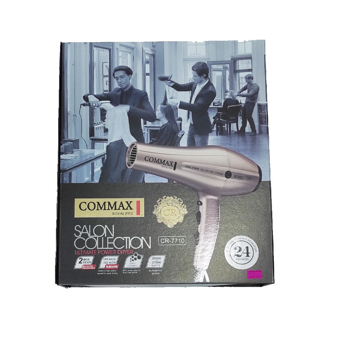 سشوار سالنی 2600 وات کوماکس COMMAX دارای موتوری با توان 2600 وات می باشد که جزو موتورهای پرقدرت محسوب می گردد. موتور این سشوار از نوع AC می باشد. این موتورها برای مصارف آرایشگاهی و حرفه ای مناسب می باشند و باید هر ۶ تا ۱۲ ماه سرویس شوند تا قدرت پرتاب سشوار افزایش پیدا کند. این نوع موتورها از ۴ بخش هسته، بدنه، ذغال و پروانه تشکیل می شوند. که هر ۲ تا ۳ سال ذغال آن ها باید تعویض گردد.