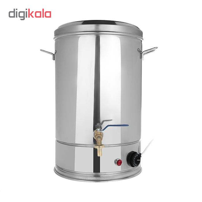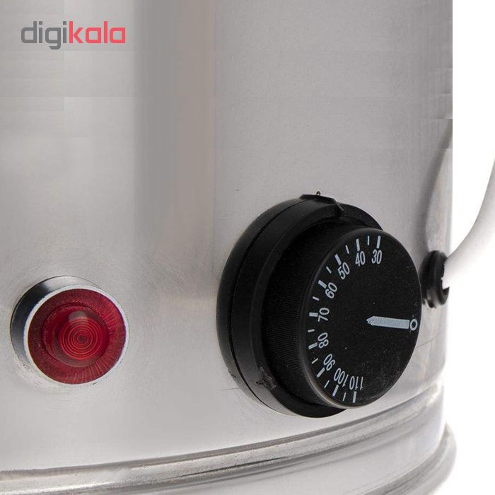 اگر قصد تهیه سماور برقی با گنجایش بالا دارید، یکی از گزینههایتان تهیه سماور برقی صنعتی است. این سماور دارای گنجایش 30 لیتری بوده و برای مراسمها بزرگ مذهبی، همایش ها و گردهمایی ها کارایی بالایی دارد. جنسی که برای این مدل در نظر گرفته شده استیل است. استفاده از این جنس باعث شده تا ماندگاری و طول عمر سماورتان افزایش یابد. بر روی این سماور دو دستگیره قرار دارد. با استفاده از این دستگیره جابهجایی سماور آسانتر میشود. یکی از ویژگیهای سماور برقی صنعتی سیم 150 سانتیمتری است. بر روی این سماور دکمه چرخشی جهت تنظیم دما قرار گرفته است. شما قادرید دمای سماور را از 30 تا 110 درجه تنظیم کنید و با رسیدن دمای مایع به درجه مورد نظر، دستگاه به طور اتوماتیک خاموش می شود و از آسیب رسیدن به سماور جلوگیری می کند. همچنین برای افزایش طول عمر سماور همواره از وجود آب داخل مخزن اطمینان حاصل کنید. همچنین این سماور برقی مجهز به سبد فیلتر چای بوده و امکان تهیه چای بدون تفاله را فراهم می کند. شیر دسته گازی نصب شده از کارایی و دوام بالایی برخوردار است. طراحی دوجداره این سماور به همراه عایق درون پشم شیشه، دارای دو مزیت حفظ دمای آب درون در مدت طولانی تر و جلوگیری از داغ شدن بدنه بیرونی سماور را فراهم میکند. بنابراین امکان سوختگی در هنگام دست زدن به بدنه سماور وجود نخواهد داشت. همچنین این عایق بندی میزان مصرف انرژی را به میزان قابل توجهی کاهش داده و دمای آب پس از گرم شدن برای چندین ساعت حفظ می شود. بنابراین میتوان مانند فلاسک از این سماور برقی نیز بهره گرفت و با یک تیر دو نشان را زد. این سماور با برخورداری از المنت 3000 واتی در مدت زمان کوتاهی آب را به نقطه جوش رسانده و خدمت رسانی تا 150 نفر را به خوبی را میسر میسازد.
