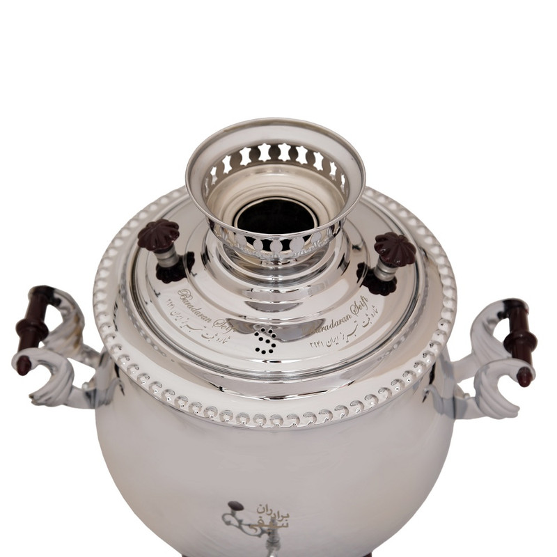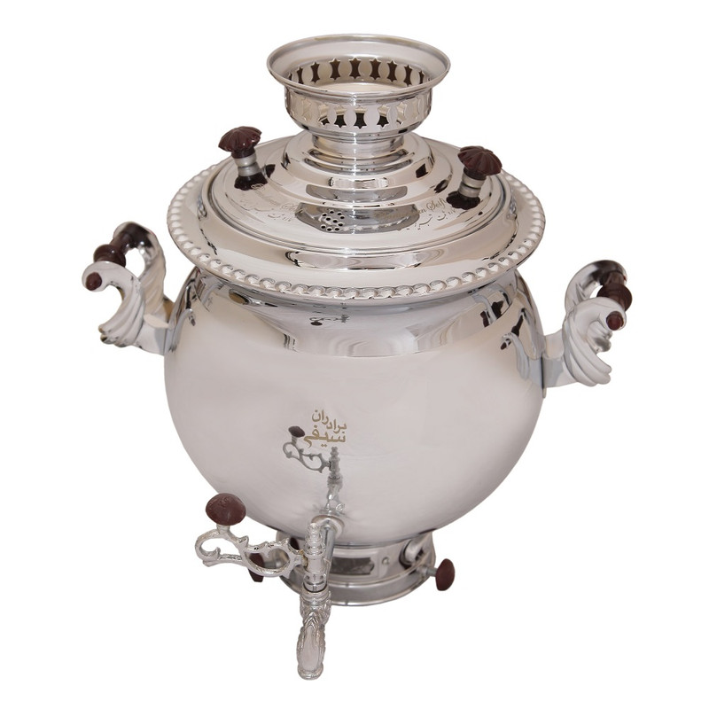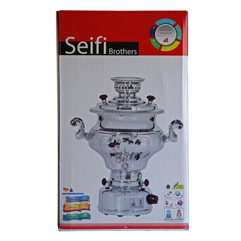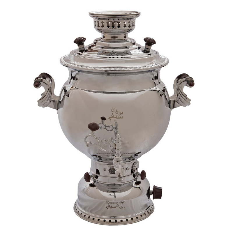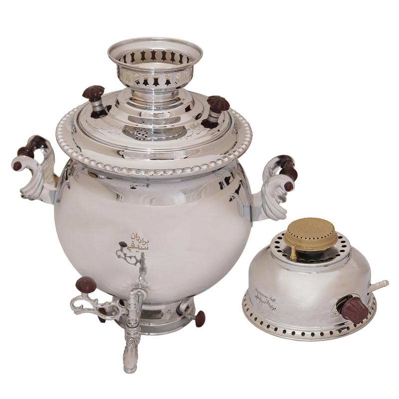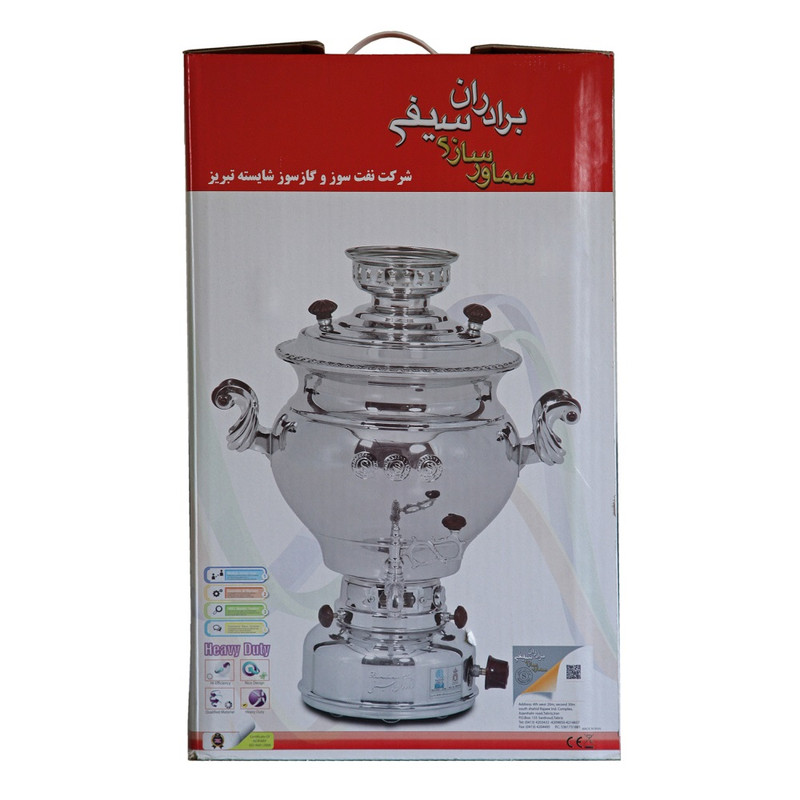سایر توضیحاتاز مشخصات سماور گازی 20 لیتری برادران سیفی می توان به سیستم ترموکوپل آن اشاره نمود که در صورت قطع و وصل گاز جریان ورودی گاز را قطع نموده و مانع خطرات احتمالی می گردد. مشعل دائمی تعبیه شده بر روی سماور های گازی برادران سیفی نیاز به روشن نمودن مجدد آن را توسط کبریت یا وسایل آتش زا را کم می کند. قبل از استفاده خوب است که دو یا سه بار آب سماور را بجوشانید و تخلیه نمایید. سطح جرم گرفته داخل منبع آب سماور را اسکاج بزنید تا جرم آن کاملا گرفته شود برای جلوگیری از جمع شدن جرم بهتر است این کار را هر 15 روز یکبار انجام دهید. هیچ گاه سماور را در شعله زیاد مورد استفاده قرار ندهید. این کار باعث پوسیدگی زود هنگام تنوره سماور میشود. همیشه سماور را با آب سرد پر کنید تا چایی زلال و مطلوبی بدست بیاورید. هیچگاه پایه سماور را شستشو ندهید چون باعث آسیب به دستگاه میشود سماور گازی 20 لیتری مدل ترمو یکی از سماور های گروه صنعتی برادران سیفی میباشد که مانند دیگر سماور های این تولیدی، از طراحی زیبا و شکیلی برخوردار است. این سماور گازی هرگز بدون آب نمیسوزد و مطابق با استاندارد های ملی طراحی شده است. جنس بدنه سماور گازی 20 لیتری برنج و بسیار شفاف میباشد. گروه صنعتی برادران سیفی با بیش از 75 سال سابقه درخشان اولین تولید کننده شیک ترین و مرغوب ترین سماور های یکپارچه نفتی، گازی معمولی، گازی ترموکوبل دار، زغالی، روگازی برقی در طرح ها و اندازه های متفاوت مشغول به فعالیت می باشند. سماور گازی 20 لیتری برادران سیفی برای خانواده ای که مصرف چای بالایی دارند بسیار مناسب است و از لحاظ قیمت و کیفیت بسیار مناسب می باشد. قبل از استفاده بهتر است دو یا سه بار آب سماور را جوشانده و تخلیه کنید. برای تمیز کردن جرم جداره ی داخلی آن هرگز از اسید و سرکه استفاده نکنید. سطح جرم گرفته داخل منبع آب سماور را اسکاج بزنید تا جرم آن کاملا گرفته شود برای جلوگیری از جمع شدن جرم بهتر است این کار را هر 15 روز یکبار انجام دهید. هیچ گاه سماور را در شعله زیاد مورد استفاده قرار ندهید این کار باعث پوسیدگی زود هنگام تنوره سماور خواهد شد. همیشه سماور را با آب سرد پر کنید تا چایی زلال و مطلوبی بدست آورید. از شستن اجاق (چراغ و پایه) سماور اجتناب کنید.