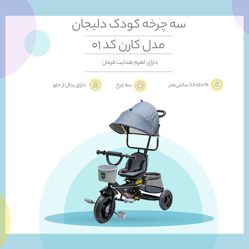 سهچرخه کودک دلیجان مدل کارن کد 01 دارای سه چرخ است که باعث میشود کودکان بتوانند به راحتی در مسیرهای مختف حرکت کنند. وسایل متحرک مانند ماشین و موتور، همیشه جذابیت خاصی برای کودکان و نوجوانان دارند. کودکان علاقه زیادی دارند تا از این وسایل استفاده کرده، و لذت حرکت و هدایت آن ها را تجربه کنند. نحوه کنترل و فرمان این سه چرخه از طریق اهرم هدایت فرمان انجام میشود که به والدین کمک میکند تا به راحتی سه چرخه را هدایت کنند. از ویژگیهای ایمنی و امنیتی این سه چرخه میتوان به کمربند ایمنی آن اشاره کرد. سه چرخه کودک دلیجان مدل کارن کد 01 دارای صندلی متحرک و آفتاب گیر است، که استفاده از آن را بسیار راحت تر و لذت بخش تر میکند. همچنین لازم به ذکر است که صندلی این سه چرخه، علاوه بر متحرک بودن، قابلیت جداسازی نیز دارد. این قابلیت این امکان را به شما می دهد تا با توجه به سن و قد کودک خود، این سهچرخه را برای استفاده راحت تر او تنظیم کنید.علاوه بر این، جلوی فرمان به عنوان محل قرارگیری برای سبد اضافی یا اسباب بازی کودکان استفاده میشود. در نهایت، محل قرارگیری پدال این سه چرخه در چرخ جلو است که به کودکان اجازه میدهد تا با استفاده از پاهای خود، سهچرخه را به حرکت درآورند.