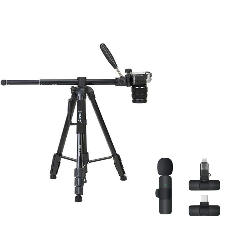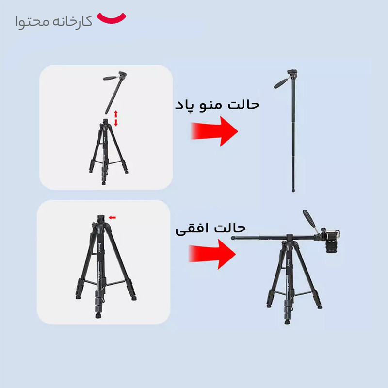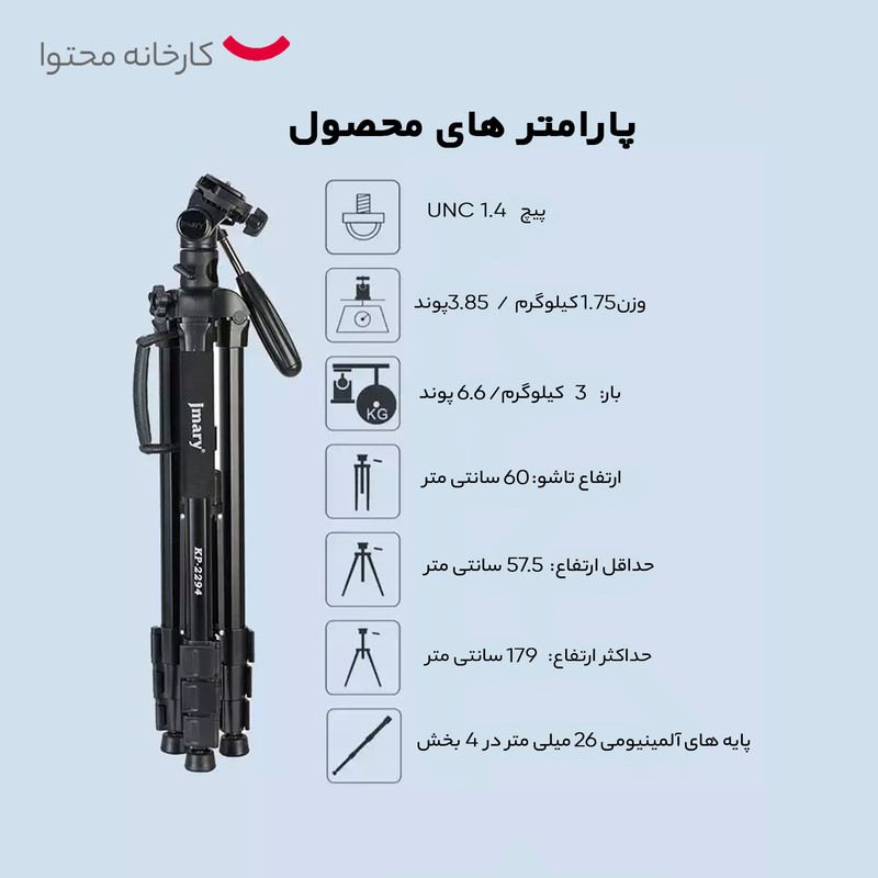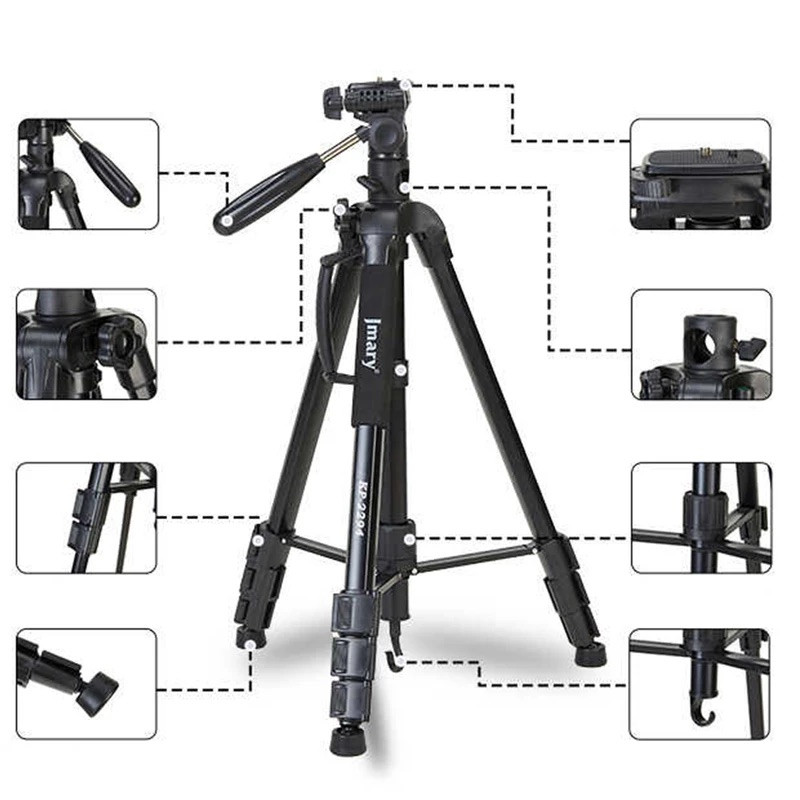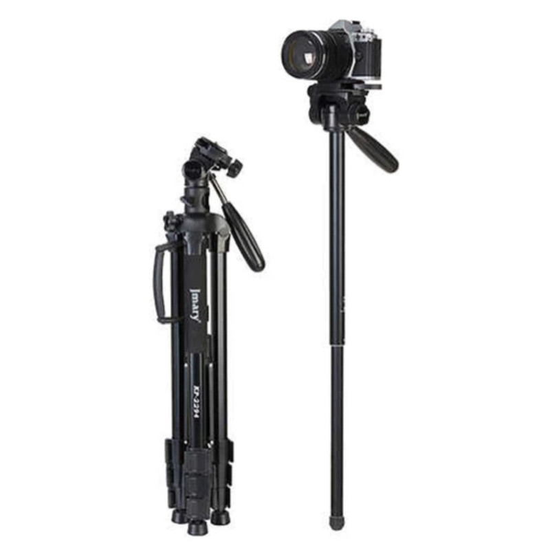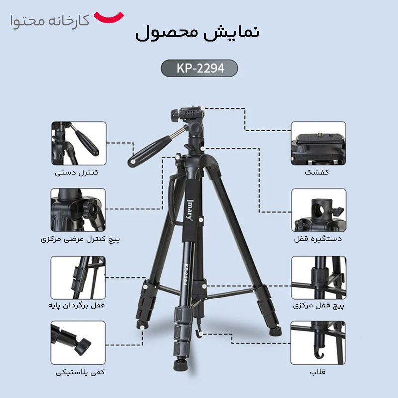 اگر هنرمند باشید و مدام مجبور به استفاده از دوربین باشید خوب میدانید یک سه پایه خوب تا چه اندازه میتواند خصوصا برای فیلمبرداری مفید باشد. سه پایه دوربین جی ماری مدل KP-2294 از سه پایههایی است که به شما بسیار کمک میکند. این سه پایه وزنی برابر 1750گرم داشته و از جنس آلومینیوم است. گستره بیشینه تحمل وزن از 3 تا 4 کیلوگرم بوده و بیشینه ارتفاع آن179 سانتی متر است. همچنین طول این سه پایه در هنگام بسته بودن 60 سانتیمتر است. تعداد قطعات پایه چهارعدد خواهد بود. این سه پایه به همراه میکروفون K8 که قابلیت اتصال به گوشی های ایفون و گوشی های اندروید تایپ C ارائه میشود. دارای کیف زیپدار بوده، کیف دارای بند رو دوشی با قابلیت بلند شدن طول بند است. این سه پایه قابلیت تبدیل به حالت تکپایه و سه پایه وحالت Tشدن را دارد. نوع قفل پایه آن گیرهای است و مقدار زاویه باز شدن هر پایه 60سانتی متر خواهد بود. نوع هد این سه پایه پن هد است