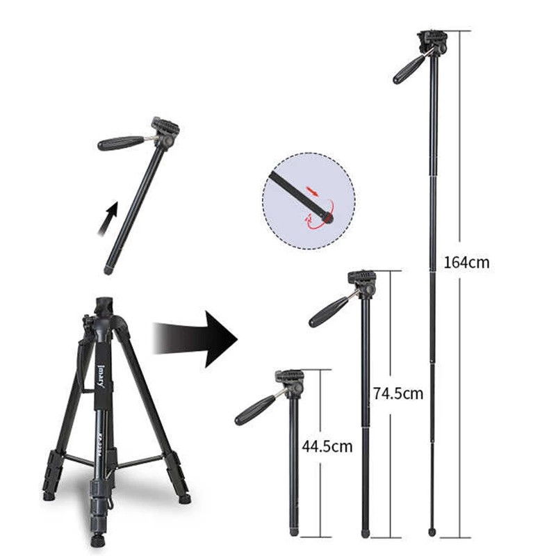 | سایر مشخصات | دارای یک عدد میکروفون K8 با قابلیت اتصال به گوشی های ایفون و گوشی های اندروید تایپ C -----قابل استفاده در ابعاد 1790mm - 1165mm - 855mm - 600mm -----چرخش 180 درجه عمودی و 90 درجه افقی -----زاویه عکاسی پانوراما با چرخش 360 درجه -----قلاب حمل زیر سه پایه -----قابل استفاده به عنوان مونوپاد در 3 طول مختلف (164cm-74.5cm-44.5cm) |