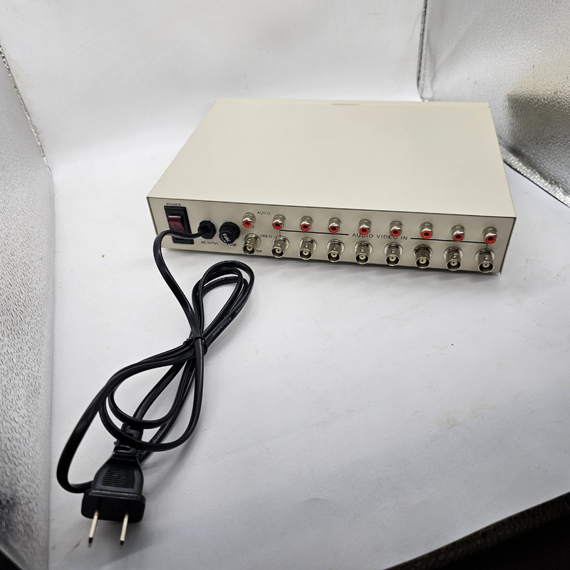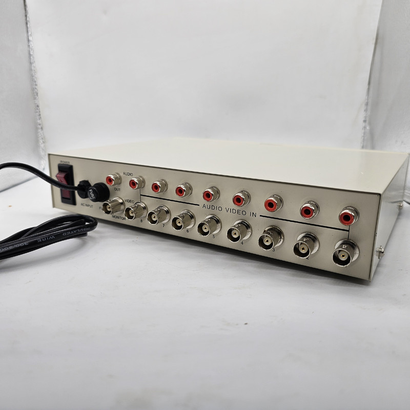 سوییچ 1 به 8 تصویر و صدای av . می توانید 8 تصویر ورودی به این دستگاه بدهید و 1 خروجی av داشته و همچنین ۸ ورودی صدا به این دستگاه بدهید و ۱ خروجی صدا داشته باشید دقت کنید این سوییچ 8 تصویر را بصورت تک تک نمایش میدهد نه به صورت 8 تصویر همزمان و دارای قابلیت عوض کردن اتوماتیک 8 تصویر که شما میتوانید آنرا با پتاسیومتری که روی دستگاه قرار دارد مدت زمان تعویض را تعویض کنید دارای قابلیت کم و زیاد کردن صدا منبع تغذیه برق ۲۲۰ ولت مستقیم