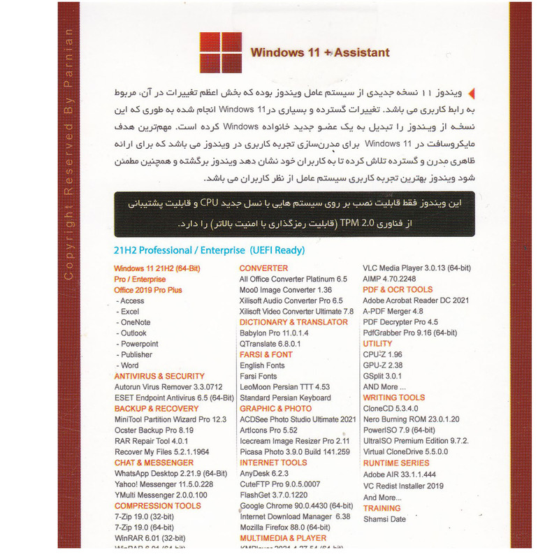 | سایر توضیحات | نسخه آخرین آپدیت 2022 می باشد این ویندوز فقط قابلیت نصب بر روی سیستم هایی با نسل جدید CPU و قابلیت پشتیبانی از فناوری TPM 2.0 (قابلیت رمزگذاری با امنیت بالاتر) را دارد. |