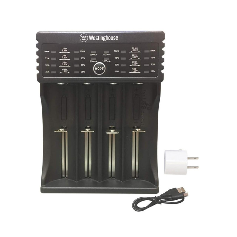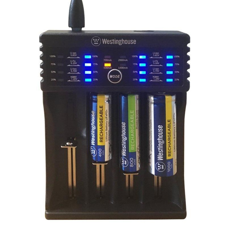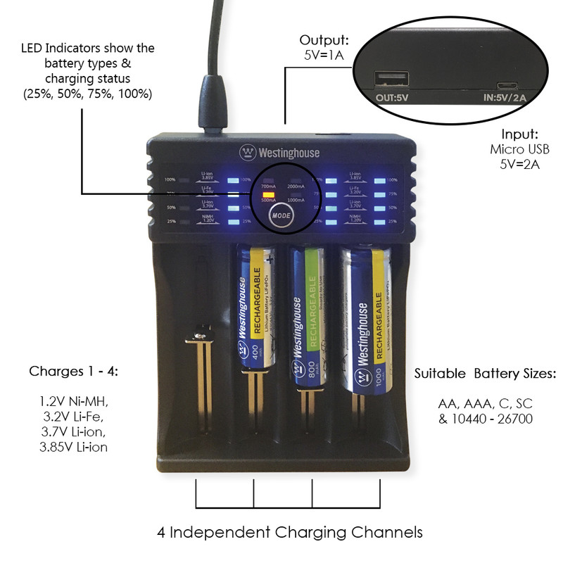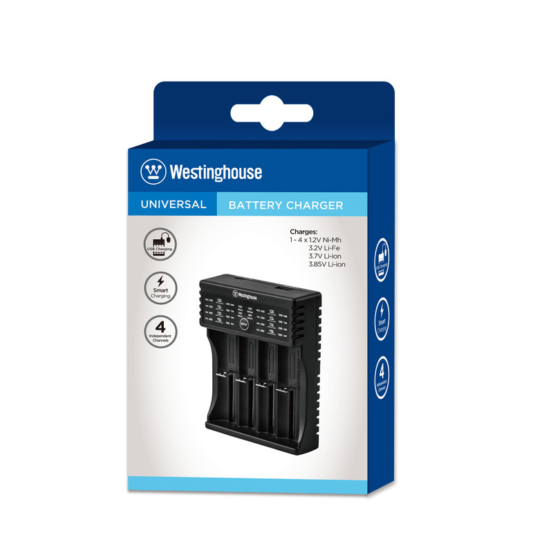 شارژر باتری وستینگهاوس یک شارژر چند منظوره بوده و قابلیت شارژ انواع باتری های شارژی ازجمله Ni-Mh , Li-Fe , Li-ion را با ولتاژهای مختلف دارد . از قابلیت های دیگر این شارژر وجود کابل خروجی USB جهت استفاده به عنوان پاور بانک است .این شارژر قابلیت محافظت در برابر شارژ اضافه ،اتصال کوتاه و نصب برعکس را دارد و به صورت هوشمند توسط چراغهای ال ای دی موجود در آن نوع باتری را تشخیص می دهد.