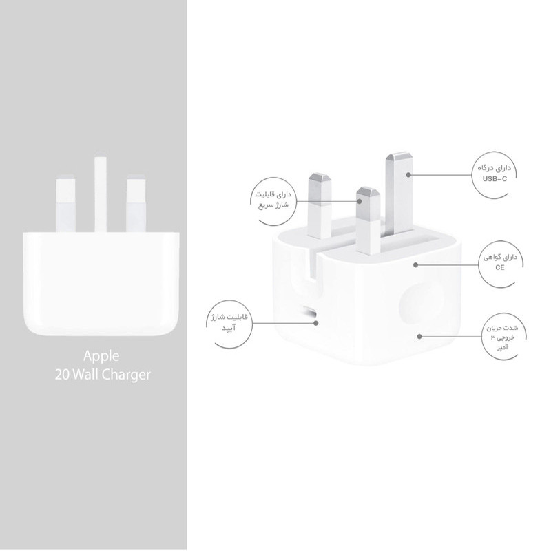 توان خروجی در این مدل از شارژرهای دیواری «اپل» 20 وات است. همچنین جریان خروجی در آن 3.0 آمپر شدت دارد و برای شارژ باتری انواع گوشی‌های موبایل، دوربین دیجیتال و دیگر لوازم از این قبیل مناسب خواهد بود. در این شارژر دیواری یک سه شاخه برق قرار گرفته که از آن برای اتصال شارژر به پریز برق استفاده می‌شود. البته توجه داشته باشید که این سه شاخه با پریز برق در ایران سازگاری ندارد و شما برای استفاده از آن باید از یک تبدیل 3 به 2 استفاده کنید. پس از استفاده از این تبدیل، شما می‌توانید شارژر را به‌طور مستقیم به پریز برق متصل کرده و دستگاه مورد نظر خود را با کمک یک کابل USB به آن متصل کنید. ولتاژ ورودی در این شارژر 220 تا 240 ولت و ولتاژ خروجی در آن 20 ولت است. وزن این شارژر 80 گرم بوده و ابعاد آن به‌صورتی طراحی شده که به‌سادگی قابل حمل باشد.