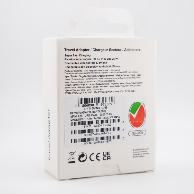 شارژر سامسونگ سوپر فست Samsung EP-TA800 25W PD 2024 EP-TA800NBEGAE این شارژ (ِEP-TA800) همراه با گوشی های رده بالا سامسونگ S21 Ultra , S21 Plus , S21 معرفی شده اند که گوشی شما را با سرعت بالایی شارژ میکنند که به بررسی ویژگی های آن میپردازیم : شارژر سامسونگ TA800 مناسب گوشی های سامسونگ سری S21 , S21 Plus , S21 Ultra میباشد البته میتوانید برای دیگر گوشی های رده بالا سامسونگ که از قابلیت سوپر فست شارژ و توان 25 وات پشتیبانی میکنند استفاده کنید. قابلیت سوپر فست شارژ و PD3.0 سامسونگ EP-TA800 شارژر سامسونگ اصلی دارای قابلیت سوپر فست شارژ بوده و توان خروجی آن 25 وات و ولتاژ و شدت جریان خروجی آن 5V/3A میباشد گوشی هایی که مجهز به تکنولوژی سوپر فست شارژ هستند را میتواند سریع تر شارژ کند و از این قابلیت استفاده کنند. شارژر سامسونگ S21 ، S21 Plus ، S21 Ultra درگاه روی شارژر سامسونگ از نوع تایپ سی میباشد توان خروجی این آداپتور 25 وات بوده و پین های شارژر سامسونگ از نوع پریز ایرانی نیست که لازم است برای آن تبدیل تهیه کنید.
