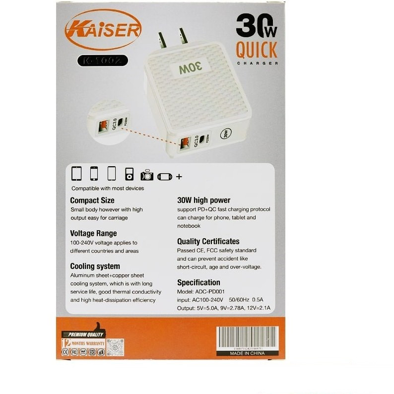 شارژر دیواری 30 وات 2 پورت کایزر مدل K-1002