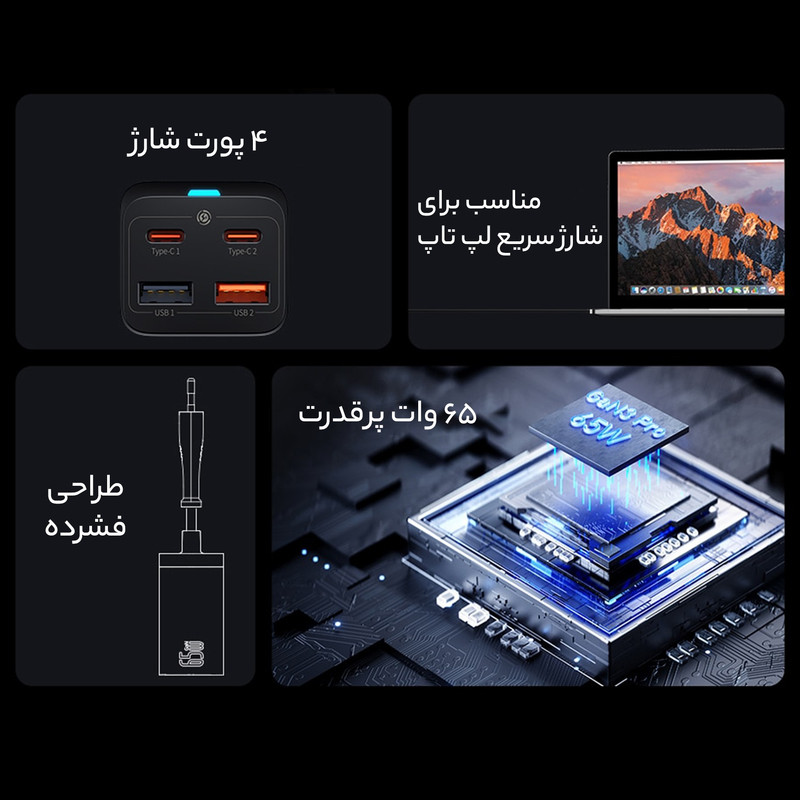 | توضیحات | شدت جریان خروجی 65 وات / بسیار جمع و جور و مناسب مسافرت / دارای پورتهای Type-C و USB / ابعاد: 40x70x36mm / پشتیبانی از فناوری GAN 3 / سطح امنیت بالا |