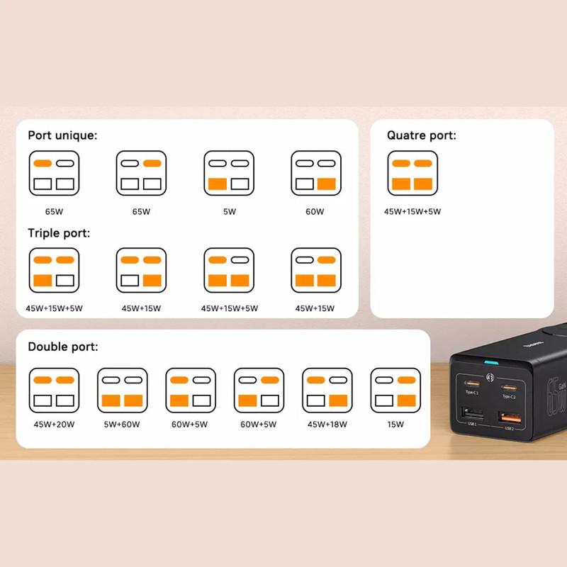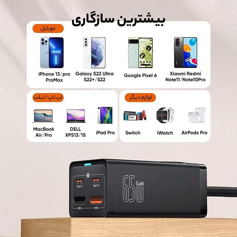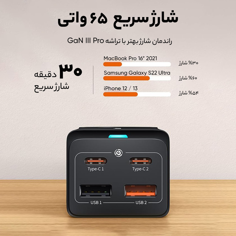 | توضیحات | مجهز به فناوری پیشرفته GaN3 / دارای چراغ LED / سوکت های برق سازگار با دوشاخه ایرانی |