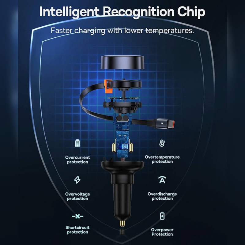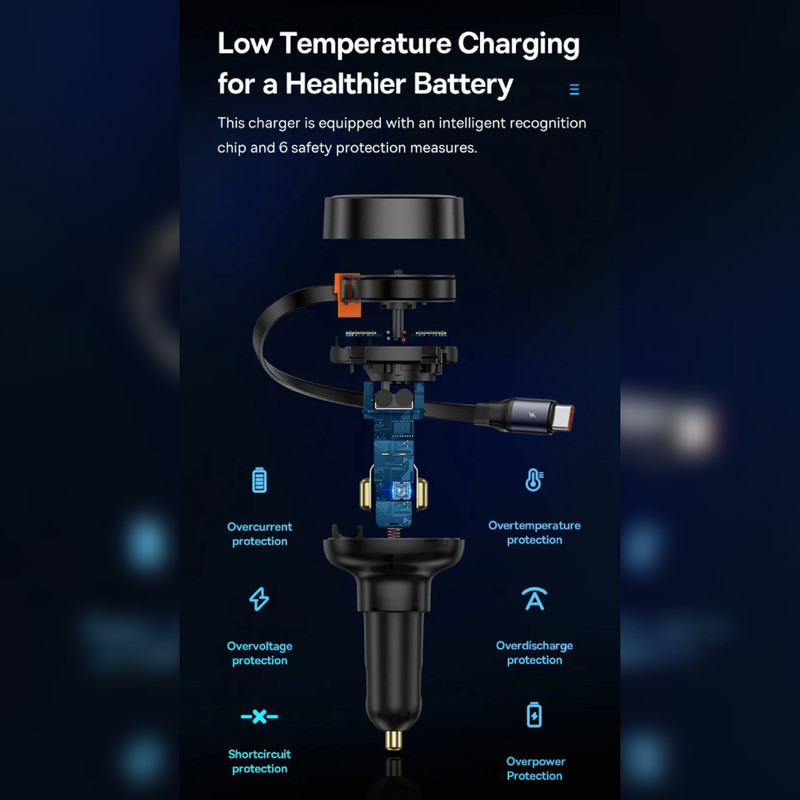 شارژر فندکی خودروی بیسوس به لطف داشتن تراشه هوشمند از دستگاه‌های در حال شارژ شدن شما در برابر شارژ بیش از حد، تغییرات شدت جریان، ولتاژ اضافی، اتصال کوتاه، تخلیه الکتریکی، دما و... محافظت می‌کند.
