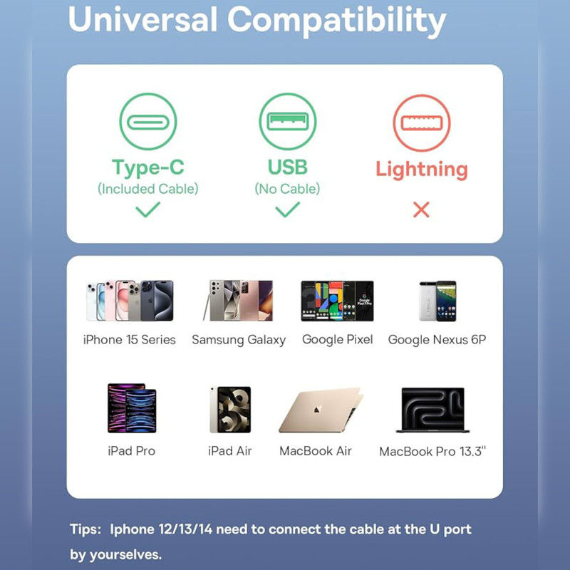 توضیحاتورودی و خروجی‌ها Total Output: 30W+30W 60W Max. Input: DC 12/24V ⎓7A output USB: 5V / 3A, 9V / 3A, 10V / 2.25A, 12V / 2.5A, (30W) output USB-C (Cable): 5V / 3A, 9V / 3A, 10V / 2.25A, 12V / 2.5A, 15V / 2A, 20V / 1.5A (30W)
