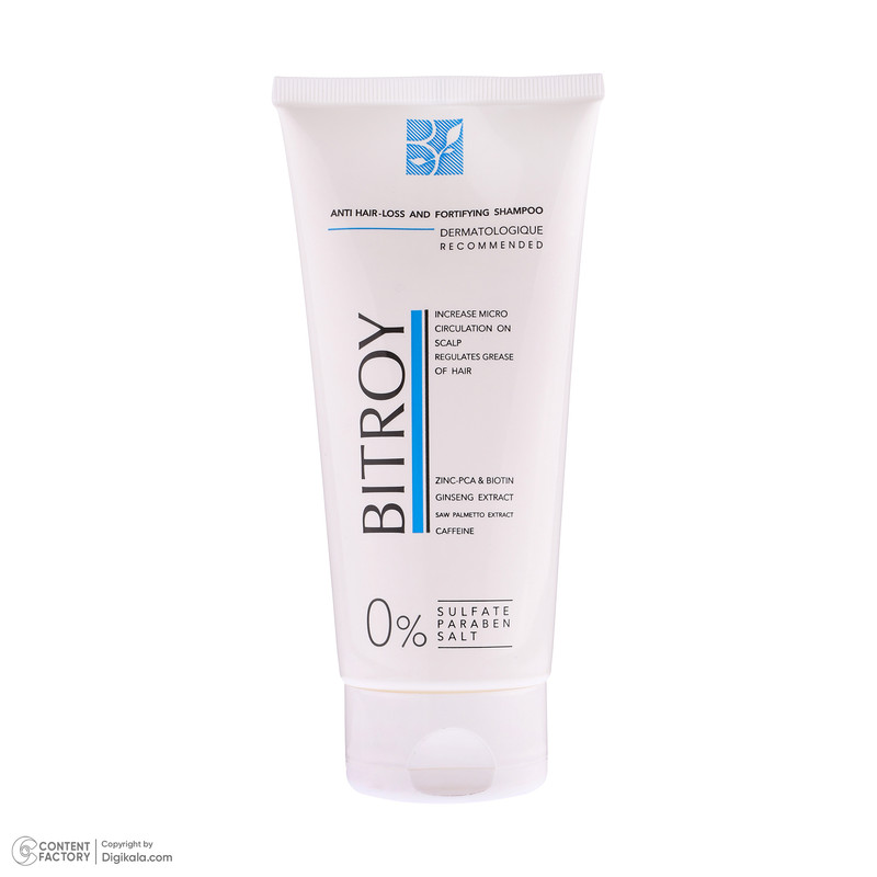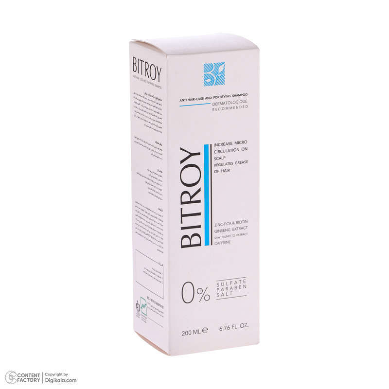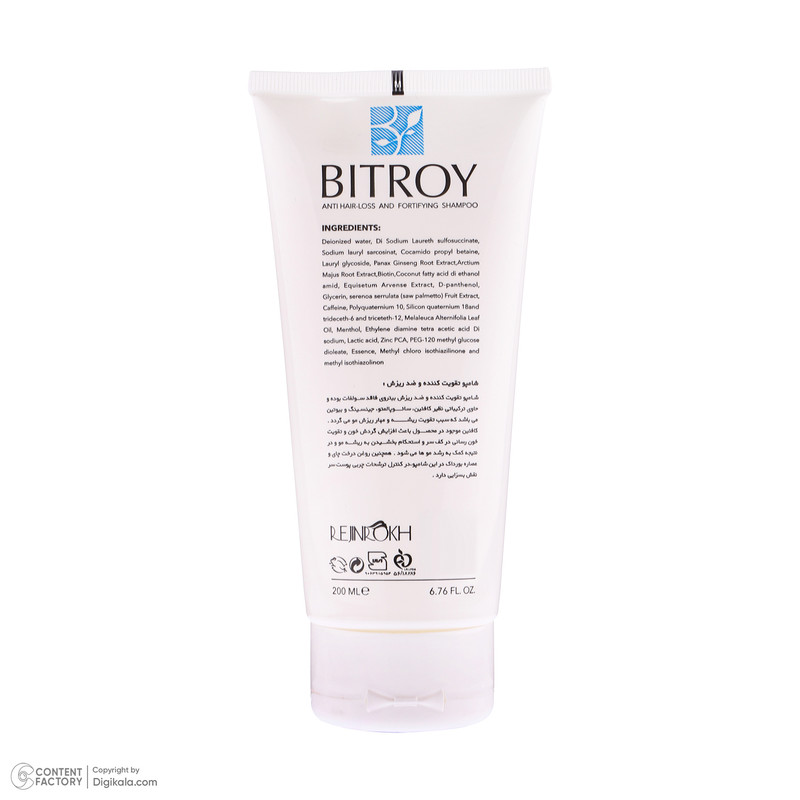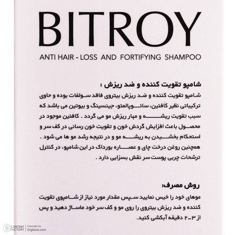 | راهنمای استفاده | مقدار مناسبی از شامپو مو بیتروی را روی موهای مرطوب پخش نموده و به آرامی با حرکات دورانی کف سر و تارهای مو را ماساژ دهید. اجازه دهید شامپو 2 الی 3 دقیقه روی مو باقی بماند تا مو و ریشه مو مواد موثر موجود در شامپو را جذب نمایند. سپس با آب سرد یا ولرم آبکشی نمایید. |