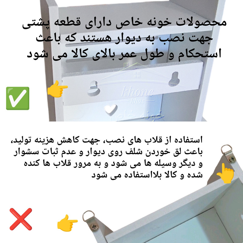 | سایر توضیحات | این محصول فقط با برند و کارتن خونه خاص عرضه می شود _ مونتاژ قطعات با خریدار محترم _ رنگ سفید جنس pvc قابل شستشو و سایر رنگها (نسکافه ای، قهوه ای و ...) از جنس mdf رنگ شده |