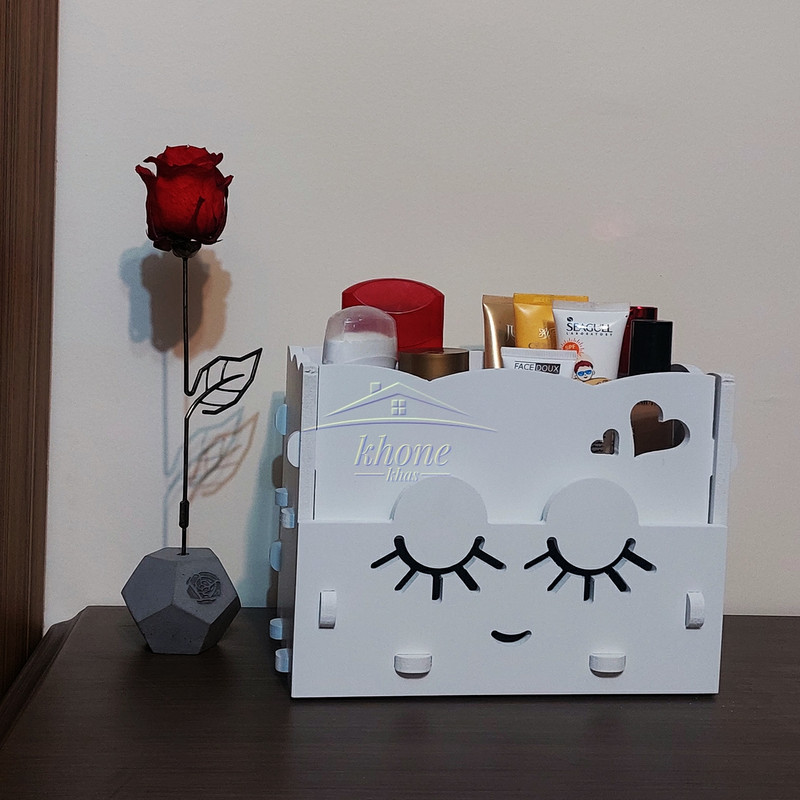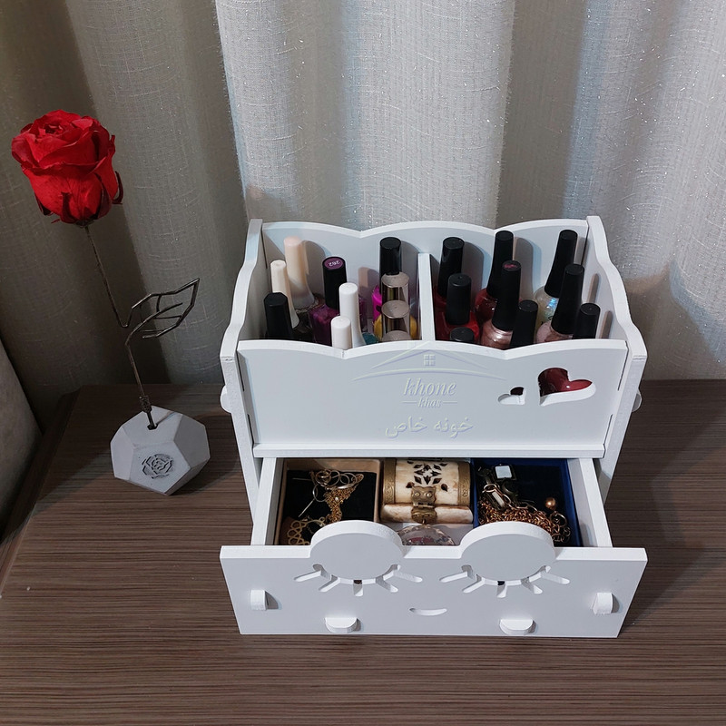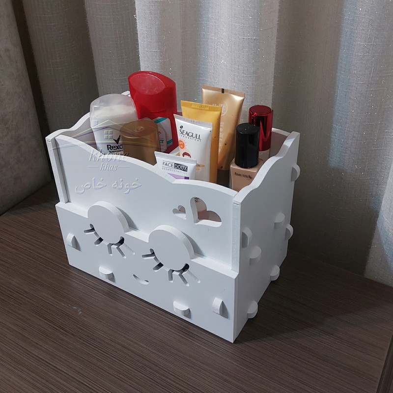 استند لوازم آرایش طرح چشمک محصول ایرانی خونه خاص بوده که از ورق درجه یک پی وی سی تهیه شده است که کاملا قابل شستشو بوده و هرگونه لک و کثیفی براحتی از روی محصول پاک می شود. این محصول نظم دهنده انواع لوازم آرایش از قبیل رژ لب، انواع پنکیک ، پاک کننده های آرایش ،انواع مداد، انواع کرم ها در سایز های متفاوت ، زیورآلات و بدلیجات ، انواع برس و شانه و سایر لوازم است و دارای یک کشو در زیر کار برای قرار دادن خرده ریزها می باشد. حتی این محصول به عنوان نظم دهنده لوازم التحریر دختر خانم ها نیز مورد استفاده قرار می گیرد. محصول اصلی با ابعاد اصلی و کیفیت عالی فقط با برند و بسته بندی خونه خاص ارسال می شود.