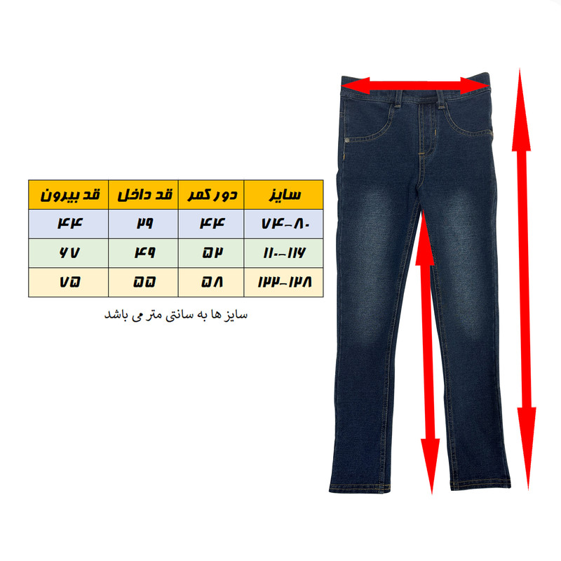 شلوار جین بچگانه مناسب (دخترانه - پسرانه) تولید کشور آلمان می باشد. این شلوار جین از کیفیت پارچه و دوخت بسیار بالایی برخوردار بوده و جنس آن 95 درصد نخ و 5 درصد الاستین می باشد.
