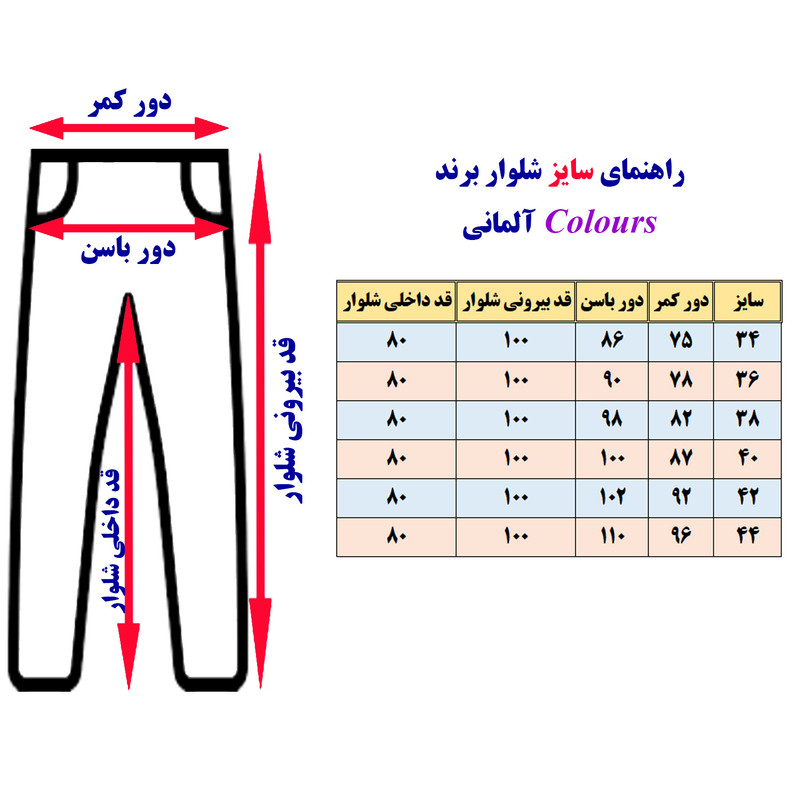 با توجه به متفاوت بودن سایز شلوارهای ایرانی و اروپایی و... حتما به تصویر پیوست این کالا در مورد راهنمای انتخاب سایز، دقت نمایید.
