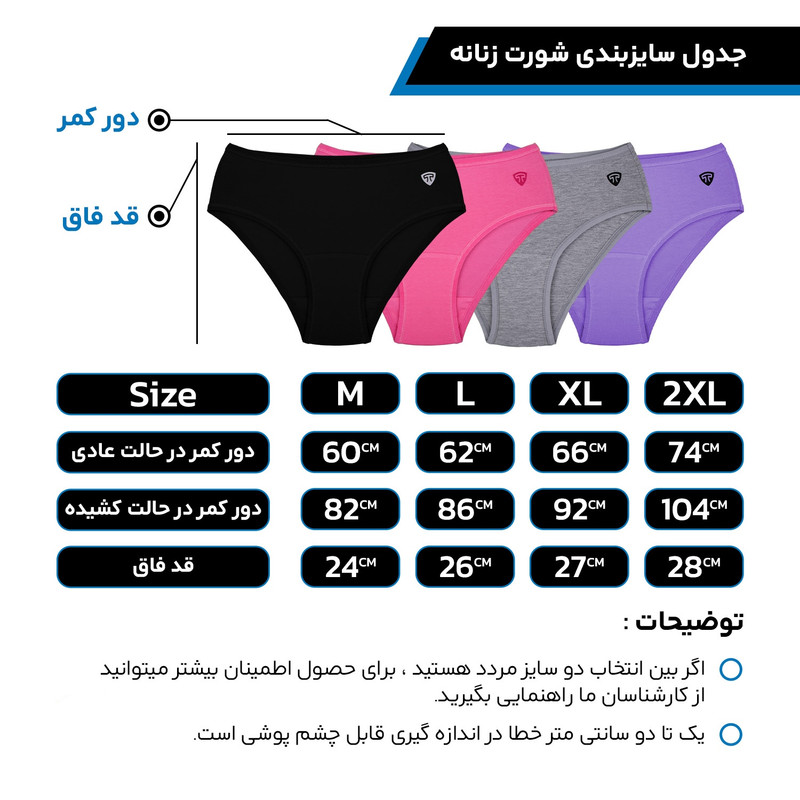 | جزئیات | سازگار با پوست های حساس مقاوم در برابر شستشو دارای کمر کشی بسیار لطیف در بسته 4 عددی جنس: 95درصد نخ پنبه 5درصد لاکرا رنگ های مشکی، ملانژ، بنفش و صورتی از سایز S تا 3XL |