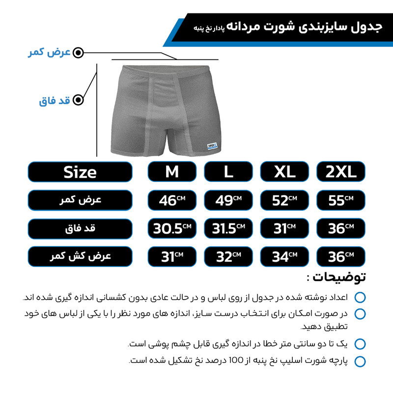 | توضیحات جنس | شورتهای ضد حساسیت تاپیک بهطور ویژه برای پوستهای حساس طراحی شدهاند و از کمر کشی بسیار لطیف و نرم برخوردارند. این شورتها علاوه بر سازگاری با پوست، از مقاومت بالایی در برابر شستشو برخوردار هستند و انتخابی ایدهآل برای استفاده روزمره محسوب میشوند. با پوشیدن این لباس زیر، هیچ گونه تحریک پوستی، سوزش یا خارش را تجربه نخواهید کرد، و حس راحتی و آرامش در تمام طول روز همراه شما خواهد بود. این شورتها در بستهبندیهای 2 عددی عرضه میشوند و با رنگبندی متنوعی به فروش میرسند. جنس شورتهای پادار پنبه کش تاپیک از 100% نخ پنبه مرغوب است که علاوه بر ایجاد راحتی، دوام و ماندگاری بالایی نیز دارد. معیار سایزبندی شورت تاپیک، اندازه دور باسن و دور کمر است. |