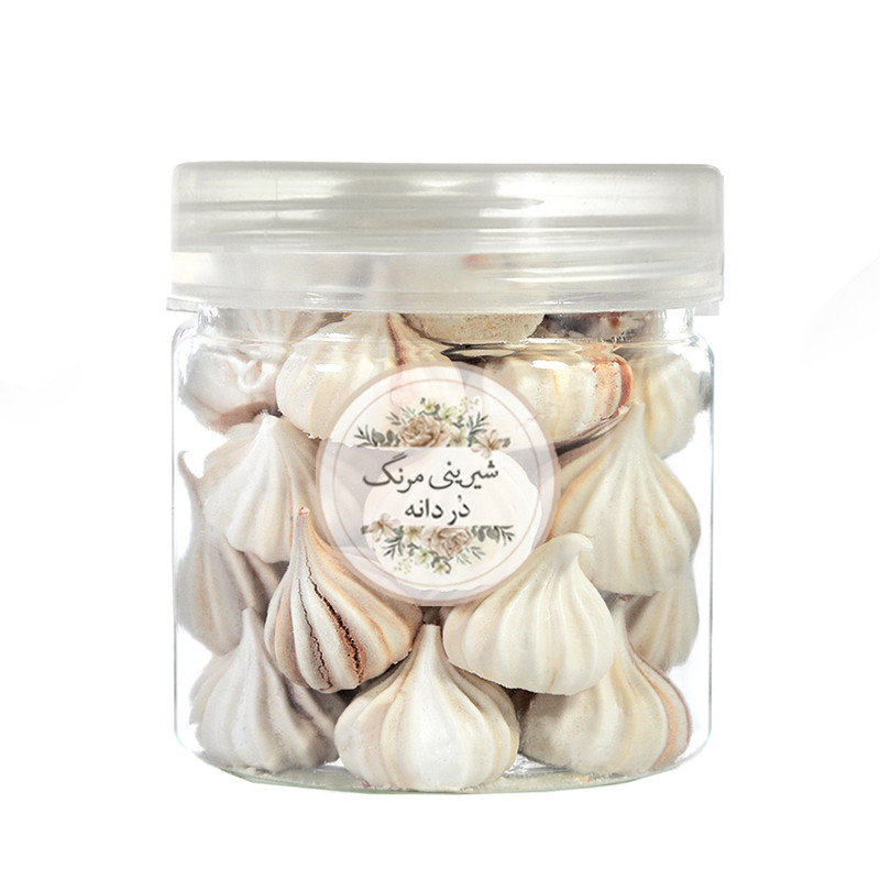 شیرینی مرنگ نسکافه ای در دانه پر از تکه های شکلات تلخ ترد و خوشمزه .آماده مصرف برای همه افراد مخصوصا کودکان و همچنین برای جایگزینی قند و غیره کنار چای یا شیر فوق العاده است. شیرینی های مرنگ باید خارج از یخچال در ظرف در بسته نگهداری شود تا ترد و پفکی باقی بماند. . در غیر اینصورت خراب نمیشود فقط ترد بودن خود را از دست میدهد.