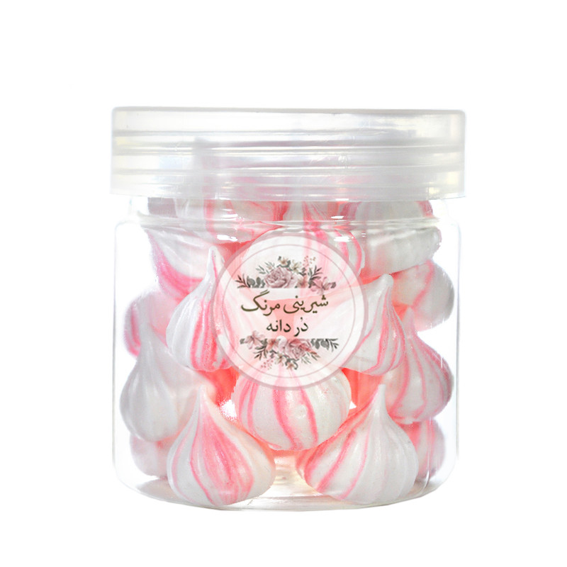 شیرینی مرنگ گل محمدی در دانه ترد و خوشمزه .آماده مصرف برای همه افراد مخصوصا کودکان و همچنین برای جایگزینی قند و غیره کنار چای یا شیر فوق العاده است. شیرینی های مرنگ باید خارج از یخچال در ظرف در بسته نگهداری شود تا ترد و پفکی باقی بماند.. در غیر اینصورت خراب نمیشود فقط ترد بودن خود را از دست میدهد.وزن خالص محصول بین 37 تا 40 گرم میباشد .