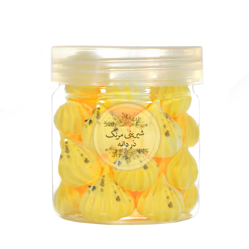 شیرینی مرنگ زعفرانی در دانه پر از پودر پسته ترد و خوشمزه .آماده مصرف برای همه افراد مخصوصا کودکان و همچنین برای جایگزینی قند و غیره کنار چای یا شیر فوق العاده است. شیرینی های مرنگ باید خارج از یخچال در ظرف در بسته نگهداری شود تا ترد و پفکی باقی بماند. . در غیر اینصورت خراب نمیشود فقط ترد بودن خود را از دست میدهد..