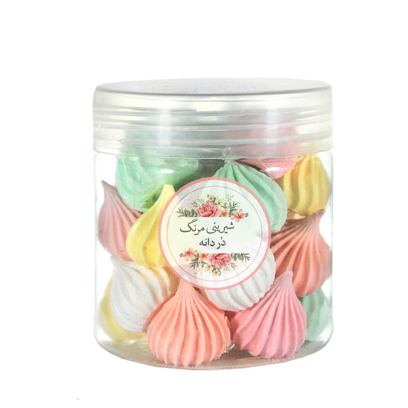 شیرینی های مرنگ در دانه با طعمهای طالبی . نارگیل . توت فرنگی . پرتقال و موز ترد و خوشمزه آماده مصرف برای همه افراد مخصوصا کودکان و همچنین برای جایگزینی قند و غیره کنار چای یا شیر فوق العاده است. همچنین برای ماندگاری بالا باید در جای خشک مثل محیط منزل در ظرف درب دار نگهداری شود.