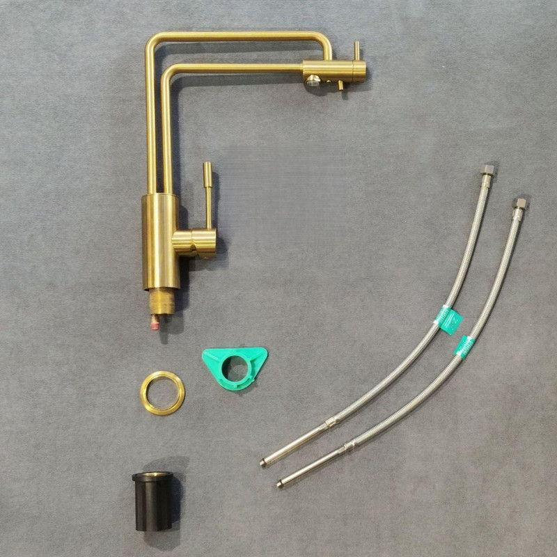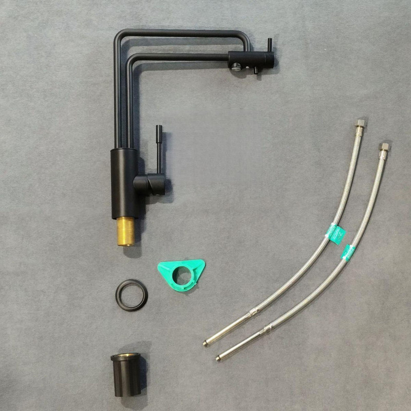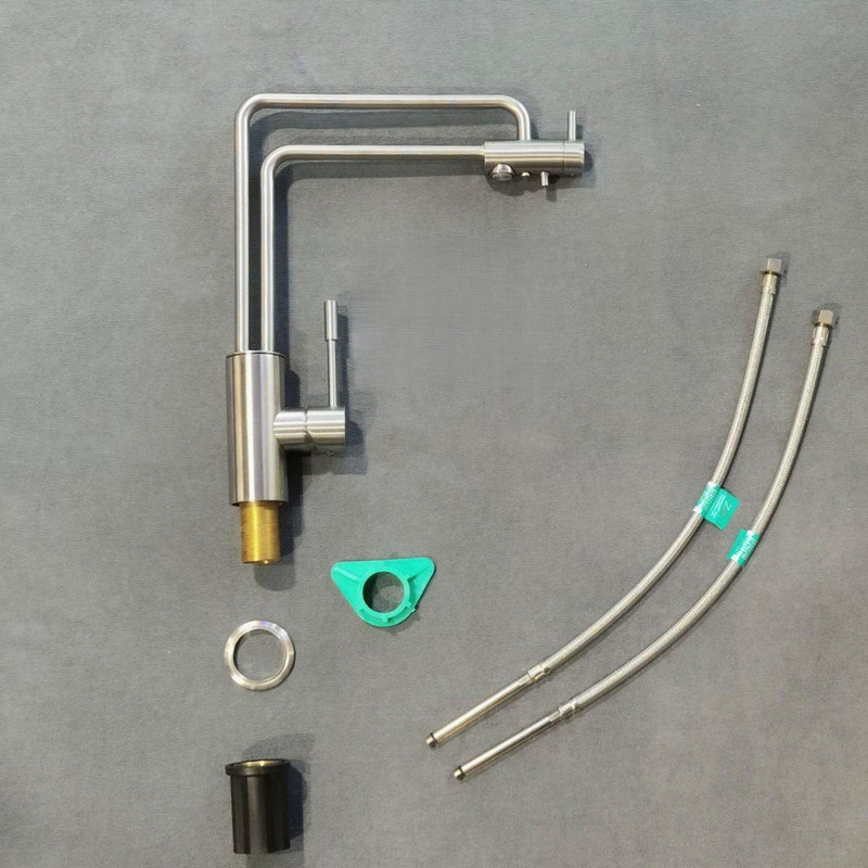 همراه با شیر، یک عدد بست آسان بند (جهت نصب راحت شیر روی سینک بدون نیاز به نصاب) + دو عدد شیلنگ پیسوار خروجی آب