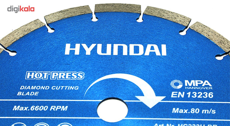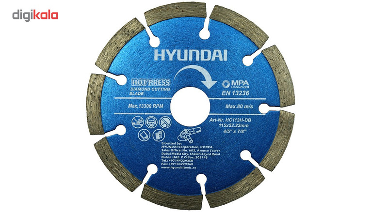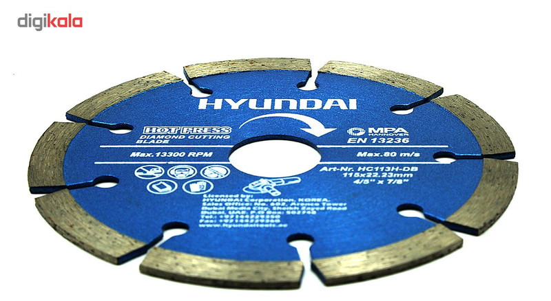 صفحه‌ی فوق یکی از محصولات تولیدی شرکت «هیوندای» (Hyundai) است. این شرکت این محصول را تحت عنوان مدل «HC113H-DB» به بازار عرضه می‌کند. این صفحه از نوع الماسه بوده و از ساختاری مستحکم و مقاوم برخوردار است. یکی از راه‌های تشخیص کیفیت ساخت مطلوب این صفحه‌ی گرانیت‌بر توجه به استاندارد EN13236 آن است. این نماد نشان از تایید استاندارد اروپا دارد. این صفحه برای نصب روی دستگاه‌های فرز طراحی شده است و با کمک آن می‌توانید قطعات گرانیتی را برش دهید. قطر شفت این محصول نیز 22.23 میلی‌متر است. برای نصب این صفحه روی فرز باید به سرعت دستگاه نیز توجه داشت. حداکثر سرعت خطی قابل تحمل این صفحه 80 متر بر ثانیه بوده و سرعت چرخشی آن نباید از مقدار 13300 دور بر دقیقه تجاوز کند. از دیگر مشخصات صفحه‌ی مدل HC113H-DB می‌توان به ضخامت 2 میلی‌متری آن اشاره کرد. شرکت هیوندای تجربه‌ی مناسبی در زمینه‌ی تولید انواع ابزارهای بریقی و دستی دارد و در این عرضه به‌خوبی عمل کرده است.