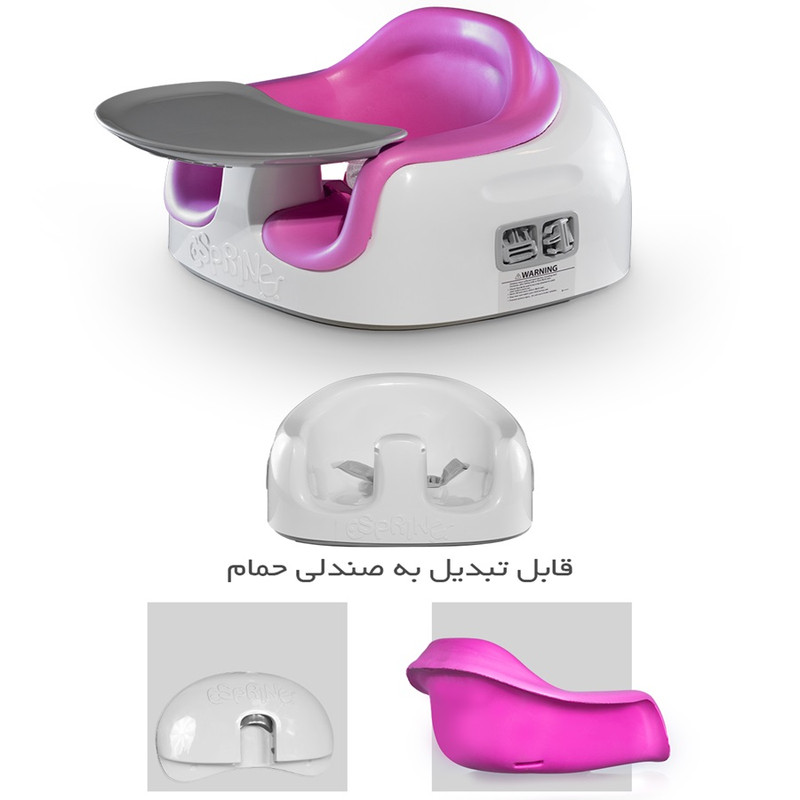 صندلی غذای کودک پرتابل اسپرینگ با قابلیت تبدیل به صندلی حمام و صندلی نشیمن و ترمزهایی از جنس TPE با ایمنی بسیار بالا پرتابل با قابلیت نصب بر روی صندلی اپن و صندلی غذا خوری و قابل استفاده در رستوران به عنوان صندلی غذا با وزن بسیار سبک با قابلیت ثابت ماندن روی سطوح ساف مثل اپن غذاخوری و میز غذا خوری.