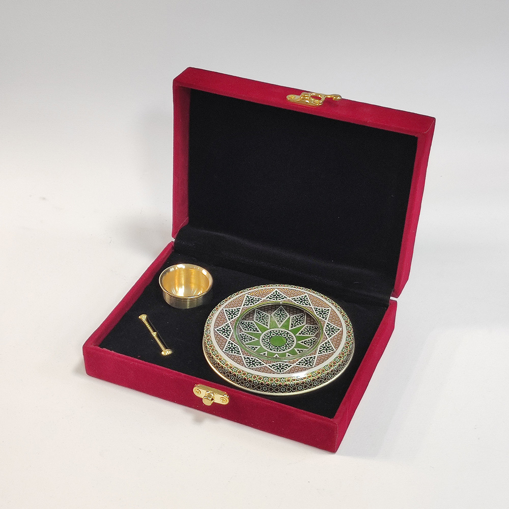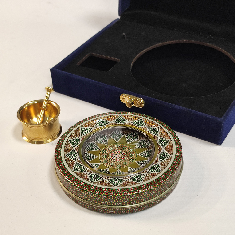 اجزای داخلی این محصول یک ظرف خاتم ۵ گرم (خالی) و یک هاون کادویی هست که داخل آنرا میتوان با زعفران و هل یا گل محمدی پر کرد.