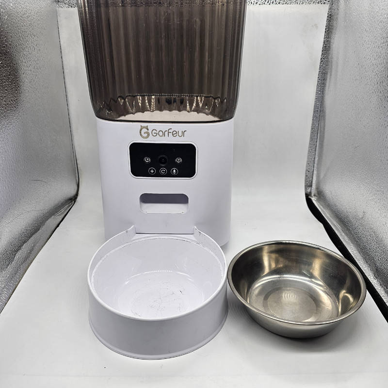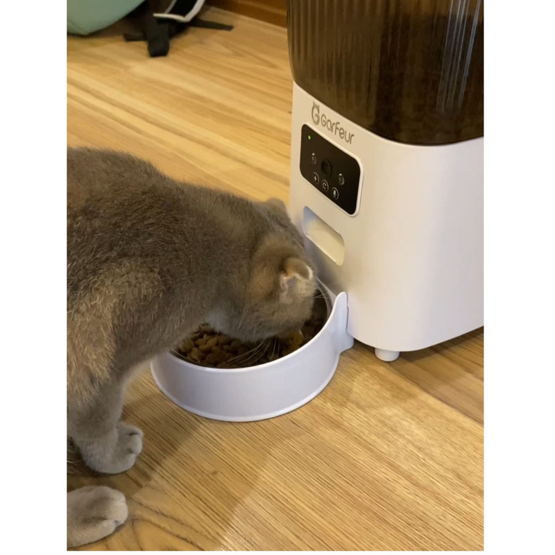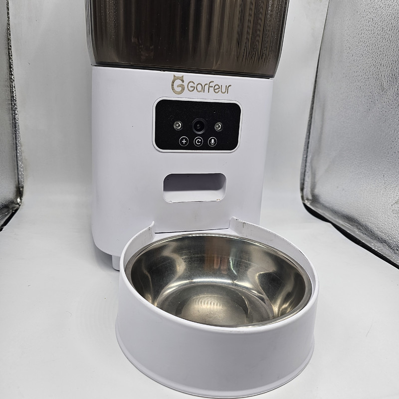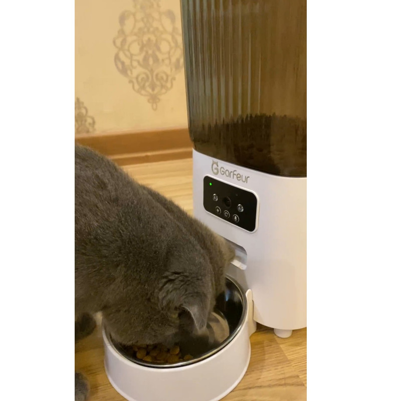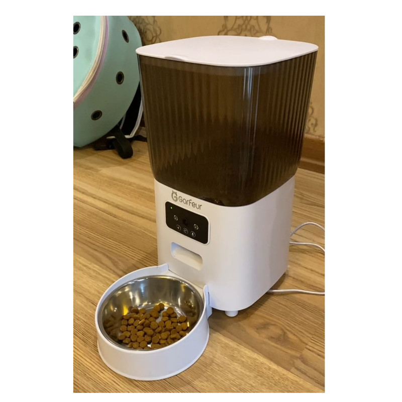 ظرف غذای اتوماتیک سگ و گربه گارفیور مدل دوربین دار یک وسیله کارآمد و با کیفیت از کمپانی معتبر GARFEUR و این دستگاه دارای کیفیت بسیار بالا می باشد که می تواند دغدغه های نگهداری از حیوانات خانگی را به حداقل برساند. این دستگاه با گنجایش 5 لیتری حدود 4 تا 5 کیلوگرم غذای خشک (بسته به چگالی غذای مصرفی) می تواند برای مدت زمانی طولانی شما، استرس غذا دادن به حیوان را از بین ببرد، فقط کافیست مخزن آن را پر کنید و دستگاه را به مودم از طریق wifi متصل کرده و از راه دور حیوان خود را مشاهده و در صورت نیاز به مقدار غذا را تعیین کرده و از راه دور برای حیوان غذا ریخته حتی شما میتوانید تنظیمات مورد نظر خود برای برنامه زمانبدی غذا دادن به حیوان را از طریق نرم افزار مربوطه انجام دهید و دستگاه طبقه برنامه تنظیم شده و به مقداری که مشخص کرده اید به حیوان شما غذا می دهد و بعد از هربار غذا دادن به حیوان از طریق نوتیفیکیشن روی گوشی همراهتان به شما اطلاع میدهد. کیفیت دوربین این محصول 10 مگاپیکسل FULL HD بوده و دارای دید در شب نیز میباشد و دارای اسپیکر و میکروفن بوده که شما صدای حیوان خود را میتوانید بشنوید و میتوانید از راه دور با حیوان صحبت کنید دارای قابلیت ضبط صدای خود که در زمان غذا ریختن دستگاه آنرا پخش میکند تا حیوان متوجه غذا شود این محصول در داخل جعبه خود دارای آدابتور و کابل تایپ c با کیفیت کنفی نیز میباشد که حیوان به سختی میتوانید آنرا پاره کند و بدون ضرر برای حیوان،از مزیت های منحصر به فرد ظرف غذای اتوماتیک عملکرد دوگانه با برق و باتری می باشد که ضریب اطمینان استفاده از این دستگاه را بالا می برد و دیگر نگران قطعی برق و گرسنه ماندن حیوان عزیزتان نخواهید بود. البته با توجه به عملکرد ظرف غذای اتوماتیک سگ و گربه با برق شهری، نیاز به استفاده از باتری فقط محدود به زمان های قطع برق خواهد بود . روی پنل دستگاه یک دکمه جهت غذا دادن به صورت دستی نیز تعبیه شده است که با فشردن آن یک پیمانه غذا تحویل می گردد. همچنین درون درب دستگاه ماده رطوبت گیر جهت حفظ کیفیت غذا تعبیه شده است. محفظه نگهداری غذا قابل شستشو بوده و کاملا از قسمت موتور قابل جداسازی می باشد. همچنین ظرف تعبیه شده جهت تغذیه حیوان از جنس استیل ضد زنگ و بسیار با کیفیت و قابل جداسازی و شستشو می باشد
