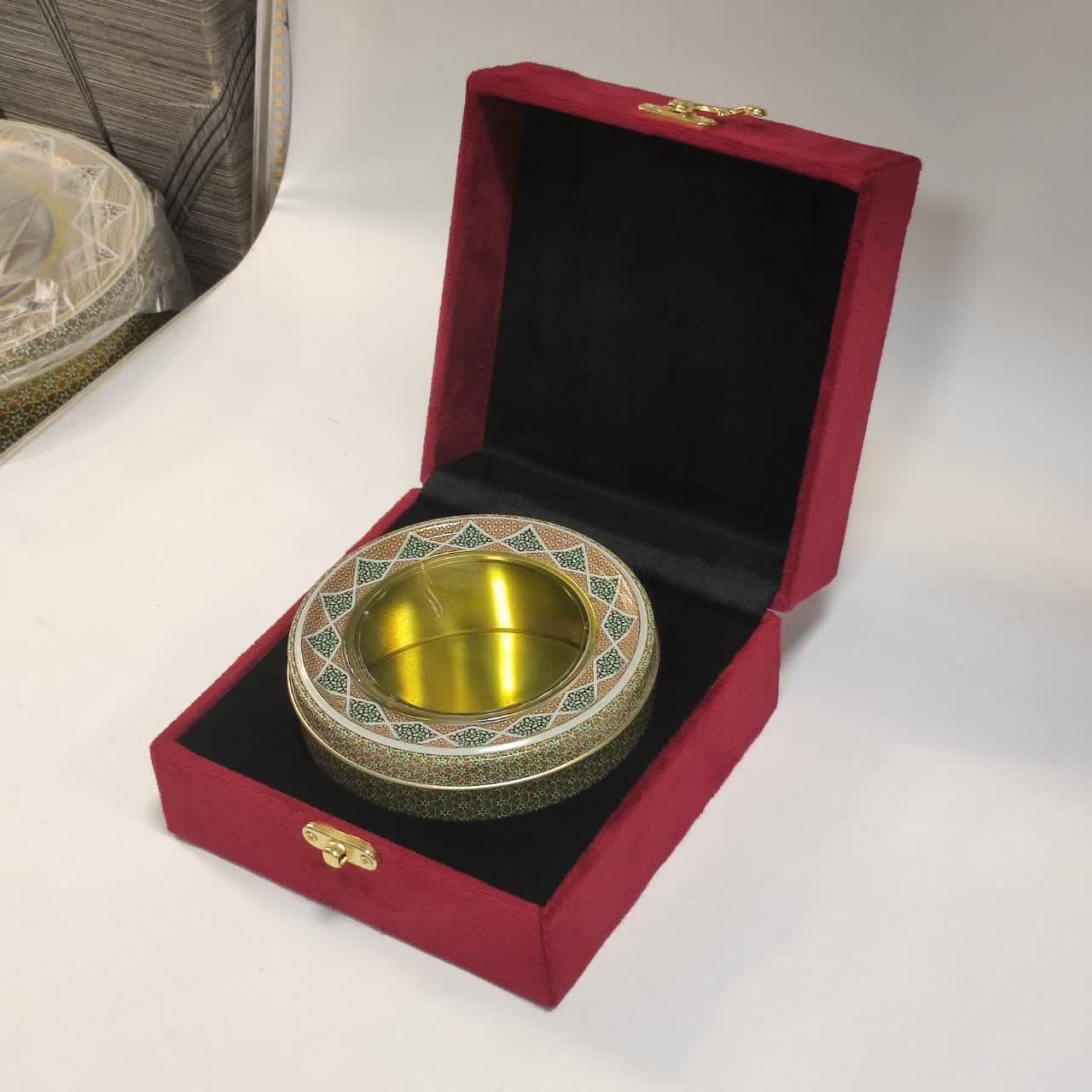 - داخل جعبه: یک ظرف خاتم زیبا دارد که گنجایش 25 گرم زعفران اصیل و با کیفیت را دارد.