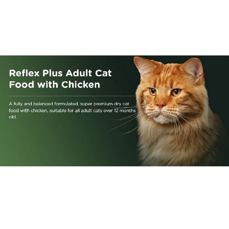 غذای گربه رفلکس پلاس حاوي گوشت مرغ، غذایی کامل و مغذی است که با طعم مرغ خود غذايي خوشخوراک براي گربهها محسوب ميشود. اين غذا پروتئینهاي مورد نیاز بدن گربهها را به طور کامل تامین میکند. اين غذا نيز مانند ساير غذاهاي رفلکس پلاس داراي زيلو-اليگوساکاريد است که باعث جلوگيري از تشکيل چربي ناخواسته يا گلايسمي در گربهها ميشود. اين ماده به صورت دستنخورده وارد سيستم گوارش ميشود و توسط باکتريهاي سيستم گوارش گربه تجزيه ميشود که نتيجه آن کاهش مشکلات گوارشي مانند نفخ است. اين غذا با فرمول جدید حاوی ویتامینها و مواد معدنی و مغذی مناسب سلامت گربه است. هم چنين با دارا بودن اسیدهای چرب امگا 3 و 6 و مخمر، برای درخشش و سلامتی پوست و موي گربه و تقویت سیستم ایمنی بدن مناسب است.