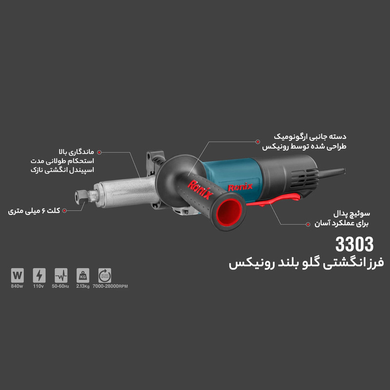 فرز انگشتی به یک موتور گیربکسی مجهز است؛ بدنه ظریف و کوچکی دارد و با توجه به اندازهی شفت خروجی آن، در دو مدل گلو بلند و گلو کوتاه تولید میشود. برای انتخاب فرزهای انگشتی باید به سرعت دورانی، سرعت برش و نوع متریال قطعهی کار توجه کنید. از فرز انگشتی گلو بلند 6 میلیمتر 840 وات رونیکس مدل 3303، برای کارهای صنعتی و همچنین، ظریفکاریهای هنری استفاده میشود.