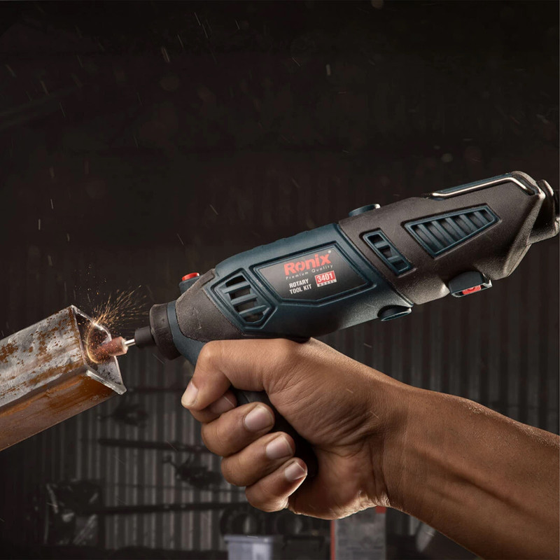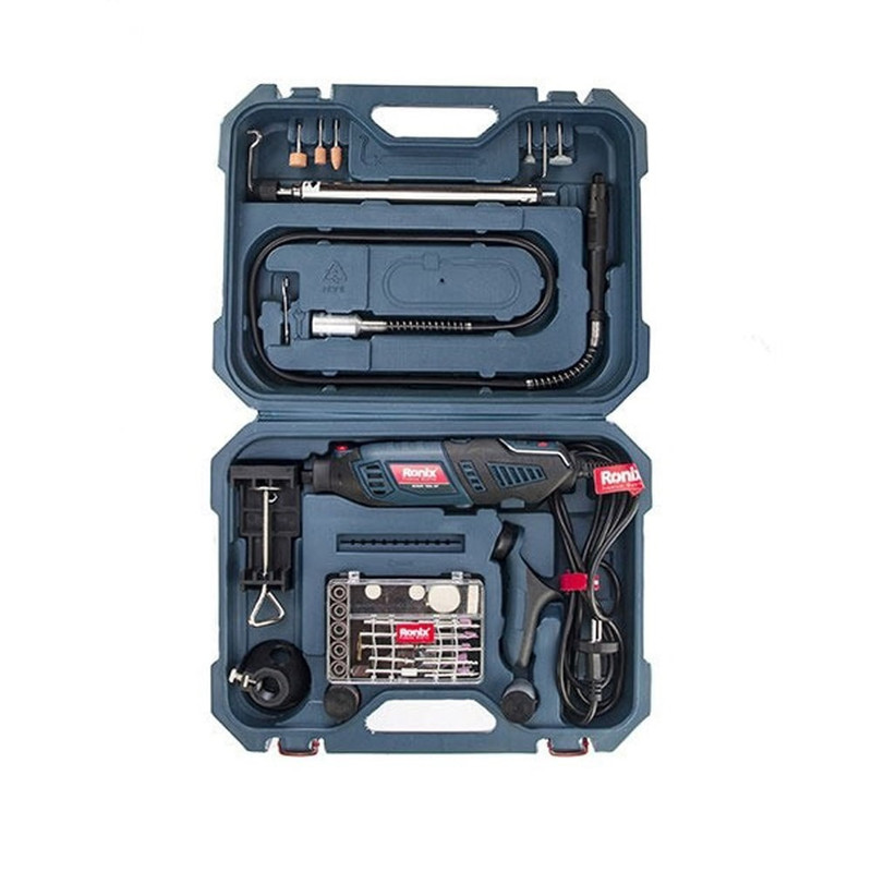 | اقلام همراه | دسته جانبی طراحی شده توسط رونیکس، یک شلنگ انعطافپذیر، پایه آویز، گیره، مهره و 126 عدد متعلقات کاربردی : - 3 عدد کولت - 122 عدد لوازم جانبی شامل: 5 سنگ فرز - 7 متهی الماسه - 12 سنباده استوانهای - 2 میلهی نگهدارندهی سنبادهی استوانهای - 36 صفحه برش دایرهای - 1 سنگ سنبادهی معمولی مکعب - 4 سنگ سنبادهی الماسه - 2 فرچهی مویی و سیمی - 1 سری کاتر - 3 مته - 1 آچار مخصوص - 2 میلهی نگهدارندهی سنگ برش و سنگ سنبادهی الماسه - 40 صفحهی دایرهای سنباده - میله اتصال سنباده - 2 سنگ برش فولاد - 1 شلنگ - پایه اتصال به میز - پایه اتصال به دستگاه - کیف پلاستیکی دفترچهی راهنما به زبان فارسی و لاتین |