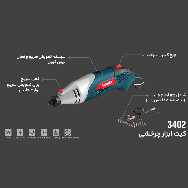 مدل 3402 ازجمله‌ی محصولات و فرزهای مینیاتوری ساخت شرکت «رونیکس» (Ronix) است. این محصول که با نام مجموعه‌ی ابزار مینیاتوری عرضه‌شده، با وسایل جانبی متعددی عرضه می‌شود. موتور این مدل قدرت مناسبی برای انجام کارهای مختلف دارد و سرعت آن هم قابل تنظیم است. 3 کولت برای کار در شرایط مختلف برای این محصول در نظر گرفته‌شده است. تنوع لوازم جانبی در کنار مدل 3402 دیده می‌شود. فرز مینیاتوری مدل 3402 یک دستگاه چندکاره محسوب می‌شود. از این دستگاه برای انجام کارهایی که به دقت بالایی نیاز دارند، استفاده می‌کنند. ازجمله این موارد می‌توان به برش دقیق فلز و چوب، دادن اشکال مختلف در چوب یا فلز، انواع سوهان‌کاری و بسیاری موارد دیگر اشاره کرد. قدرت موتور مدل 3402، برابر با 170 وات است. سرعت گردش موتور در حالت آزاد به 35000 دوربردقیقه می‌رسد. توسط یک کلید گردان 6 حالته، می‌توان سرعت گردش دستگاه را بین 8000 تا 35000 دوربردقیقه تغییر داد. با توجه به اینکه کاربرد این دستگاه در انجام کارهایی با ظرافت بالا است، می‌توان با اتصال یکی از 3 گونه‌ی کولت (سری دستگاه) به محصول، نیاز به در دست گرفتن دستگاه را برطرف کرد. در کنار این محصول 122 عدد لوازم جانبی هم وجود دارد. گونه‌‌های مختلف سنگ سنباده و برش، مته‌هایی با قطر بسیار کم، صفحه‌‎های سنباده، دو نوع فرچه و انواع پایه‌های مخصوص دستگاه در بیت این 122 عدد لوازم جانبی دیده می‌شود. در انتهای دسته‌ی محصول، یک گیره فلزی برای آویز کردن دستگاه قرار داده‌شده است. در شغل‌های مختلفی از فرز‌های مینیاتوری استفاده می‌کنند. ازجمله‌ی این مشاغل که در آن از این نوع فرز استفاده‌ی بسیار زیادی می‌کنند، تولید‌کنندگان دکورهای چوبی و فلزی هستند. شرکت رونیکس هم نمونه‌هایی از این دستگاه را تولید کرده است. شاید کیفیت ساخت محصولات رونیکس، در حد برندهای خارجی مانند بوش نباشد، اما با در نظر گرفتن قیمت و سطح کیفی مدل 3402، تهیه‌ی این محصول مقرون‌به‌صرفه به نظر می‌رسد. 3402 یکی از فرزهای مینیاتوری ساخت شرکت رونیکس است که با یک موتور 170 واتی کار می‌کند. 125 عدد انواع کولت، پایه و لوازم جانبی دیگر در کیف برزنتی محصول قرارگرفته است.