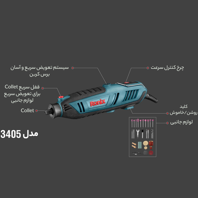 | سایر توضیحات | شامل 102 قطعه سری و متعلقات کاربردی ابزار آلات چرخشی برای انجام فعالیت های سنباده زنی _برش_سنگ زنی _کنده کاری_ تمیز کاری - پرداخت و... مجهز به بلبرینگ های ضد غبار که مانع از نفوذ گرد و غبار می شود و باعث افزایش دوام می شود. موتور قدرتمند 200 واتب که چرخشی بالغ بر 10000 تا 40000 دور در دقیقه را فراهم میکند. سیستم قفل کن پین برای تغییر آسان سری و متعلقات کاربردی و افزایش ایمنی کاربر دستگاهی با کارایی بالا، وزن سبک،مناسب برای انجام انواع مختلف عملیات کولت2/3و3/2 میلی متری برای مطابقت با سری ها و متعلقات مختلف سرعت قابل تنظیم برای مطابقت با کاربردها و نیاز های مختلف مجهز به لاستیک نرم جهت سهولت راحتتر حین کار |